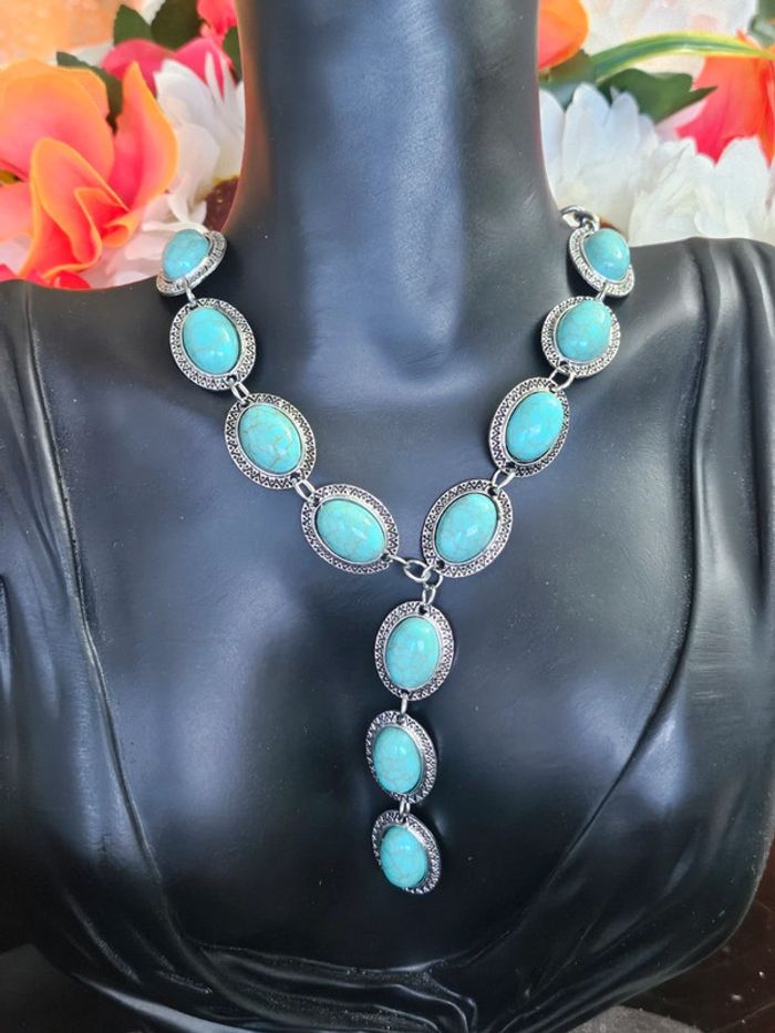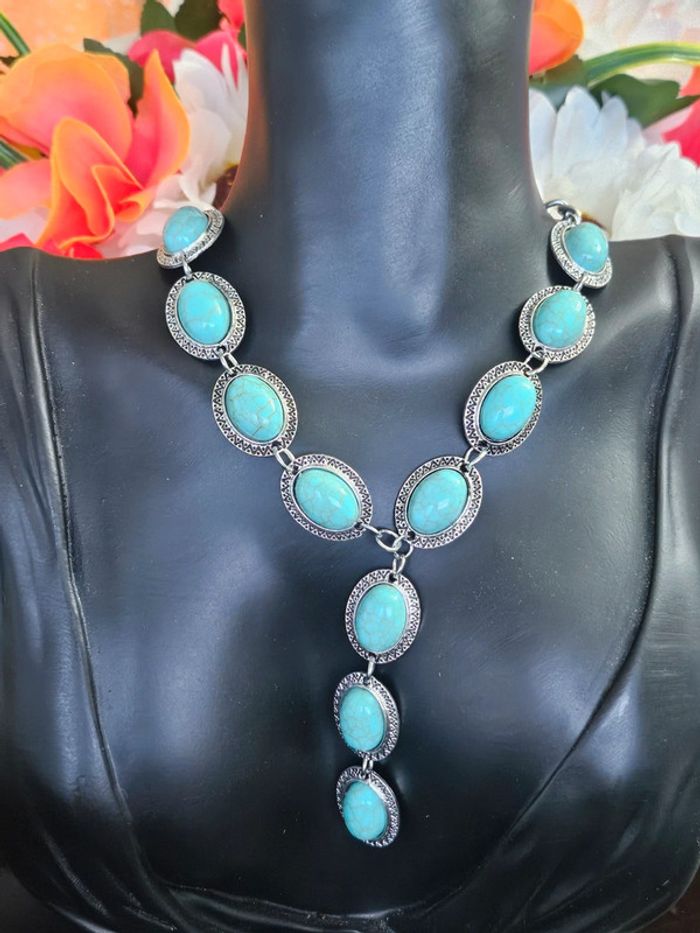 Collier avec ses pierres turquoise mélangées Neuf sans étiquette, jamais porté De marque Aihhq En acier inoxydable hypoallergenique haute qualité Ne noircit pas au fil du temps Bonne résistance au passage sous l eau Collier réglable (23/04/2025*347)