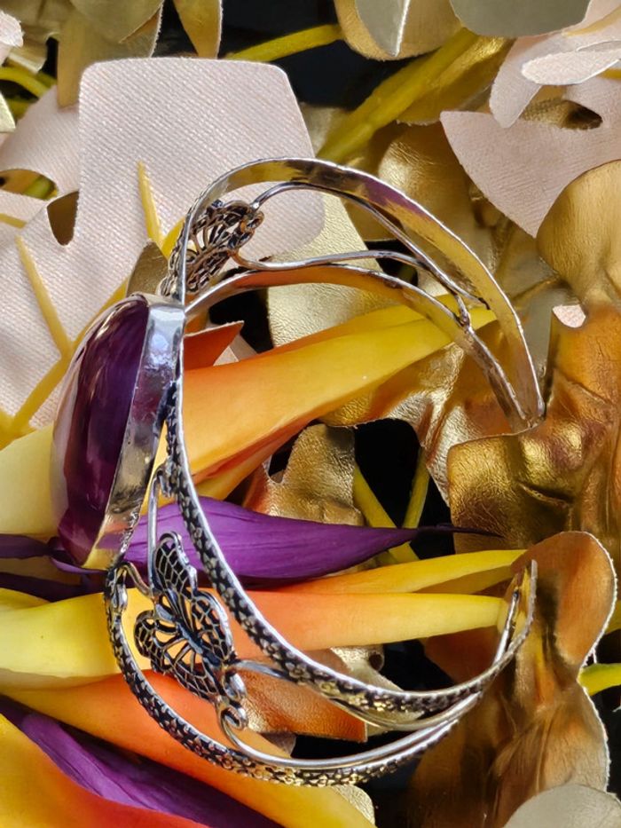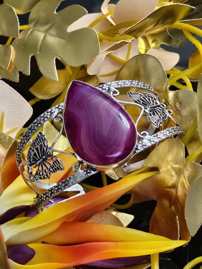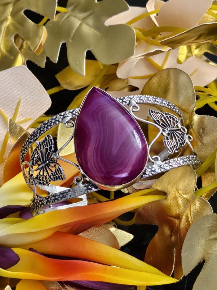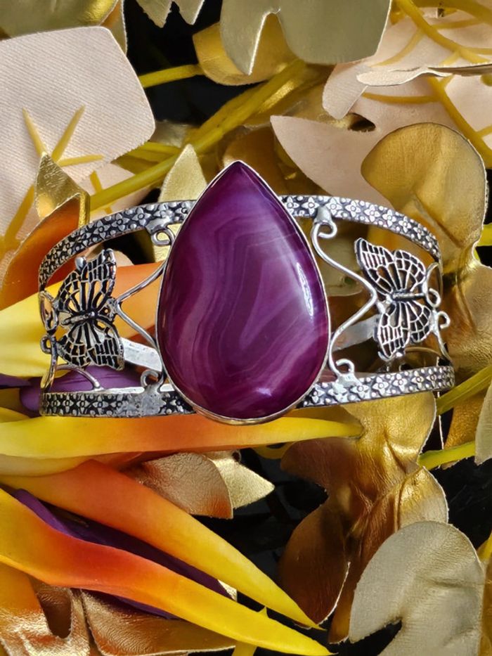 Bracelet manchette texturé en argent sterling 925 avec pierre agate Botswana Neuf sans étiquette, jamais porté Piece unique en pierre naturelle SERTIE Taille ajustable ( s adapte à tous type de poignets). Estampillé 925 (16/04/2025*198)