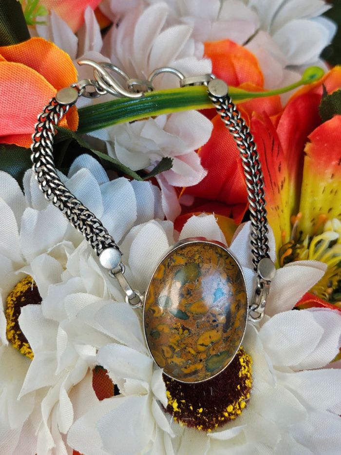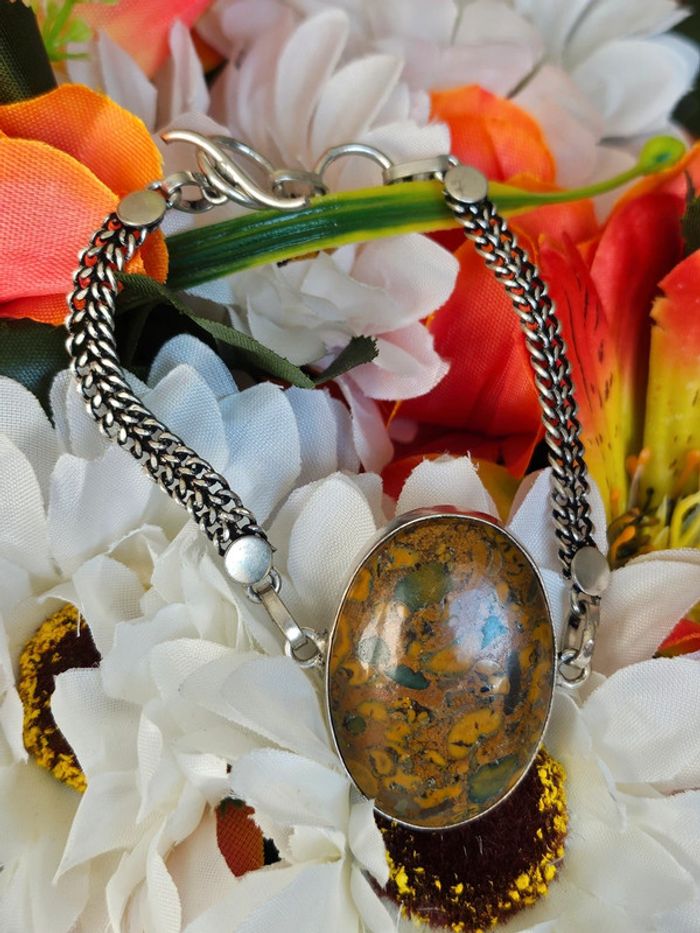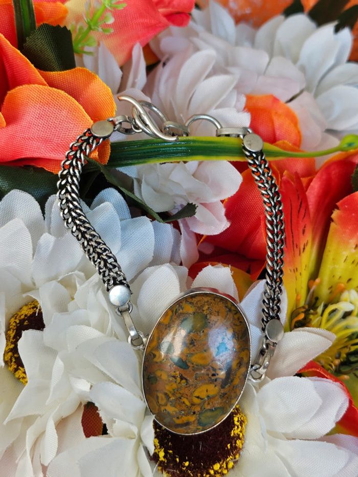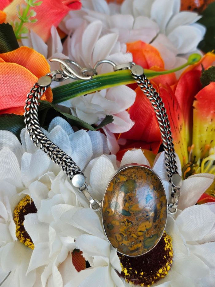 Je vous propose ce bracelet en argent Sterling 925 avec pierre jaspe de fruit. Neuf sans étiquette, non utilisée. Pièce unique en pierre naturelle SERTIE. Estampillé 925. Longueur jusqu'au 1er fermoir : 19 cm Longueur jusqu'au 2e fermoir : 21 cm (12/04/2025*086)