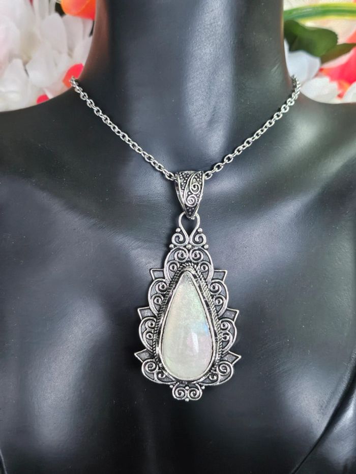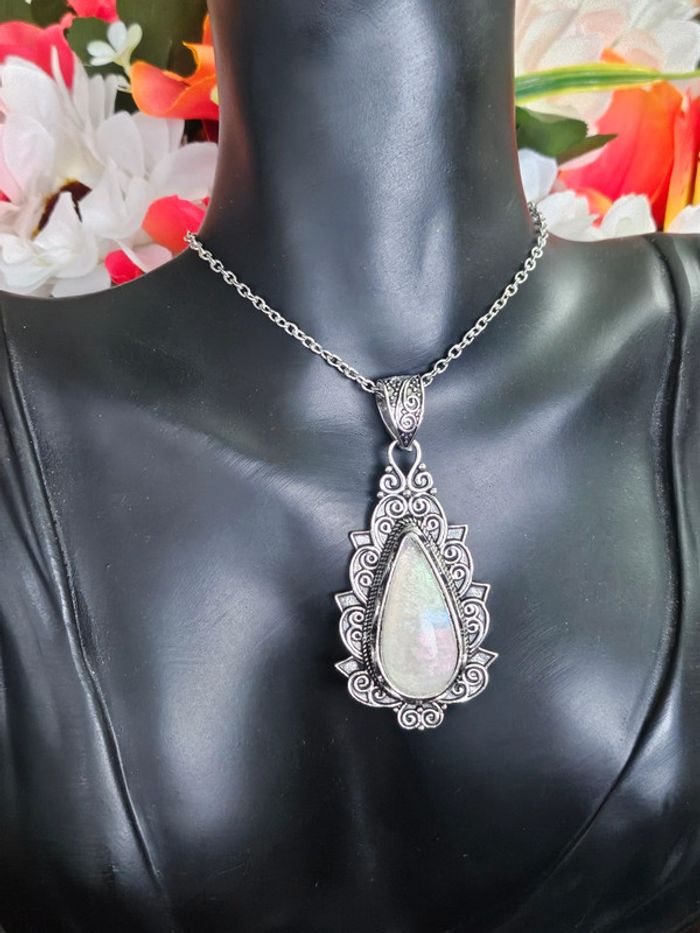 Collier texturé avec pierre de lune Neuf sans étiquette, jamais porté En acier inoxydable hypoallergenique haute qualité Ne noircit pas au fil du temps Bonne résistance au passage sous l eau Collier réglable De marque Aihhq (17/04/2025*212)