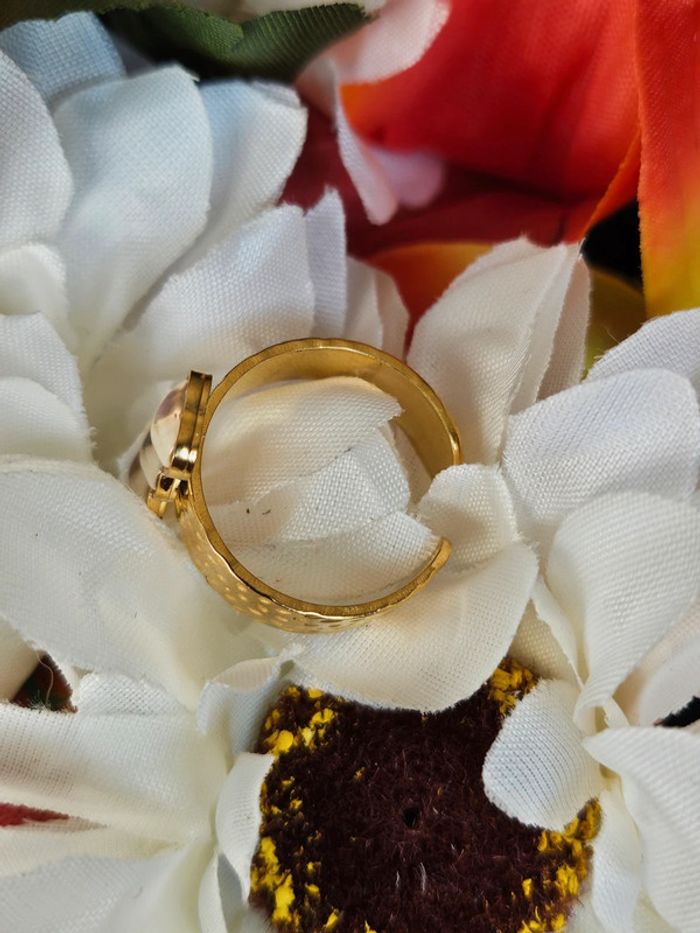Je vous propose cette bague avec ses 3 cœurs en pierre de lune. Neuve sans étiquette, non utilisée. En acier inoxydable hypoallergenique ( garantie contre les allergies). Résistante au passage sous l eau. Taille 57 (14/04/2025*120)