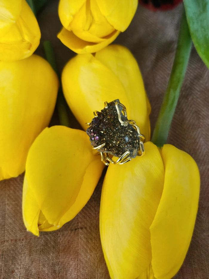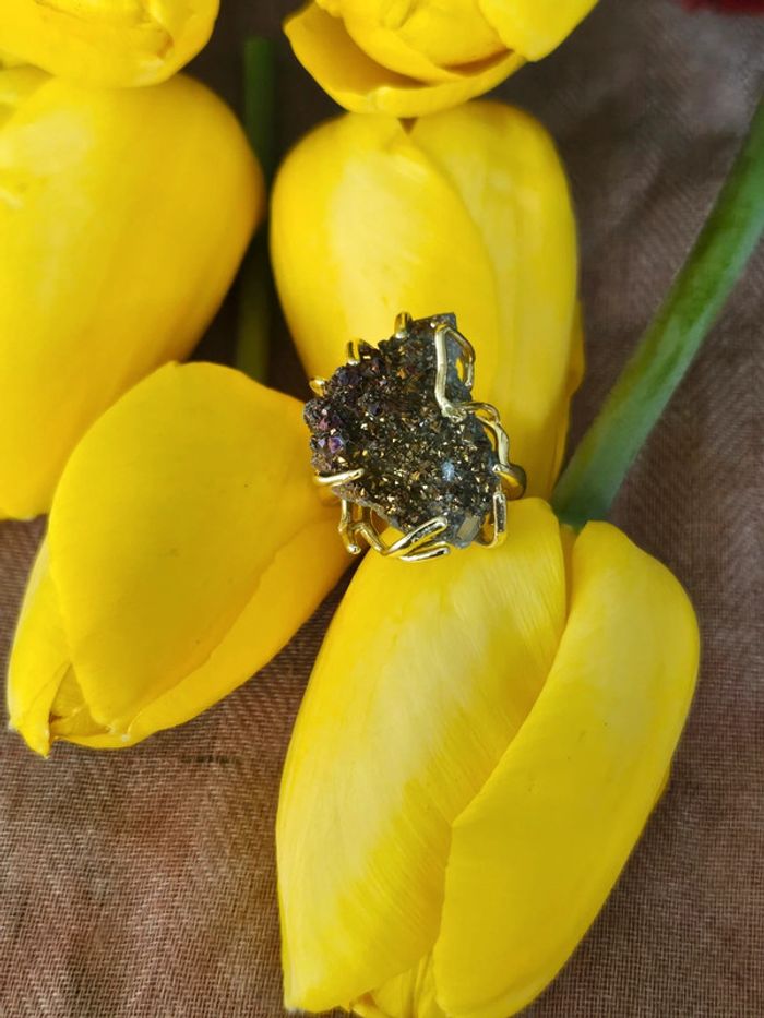 Je vous propose cette bague avec ses 4 griffes en pierre géode de quartz. Neuve sans étiquette, non utilisée. En acier inoxydable hypoallergenique( évite les allergies). Résiste à l eau. Taille 53 (05/05/2025*012)