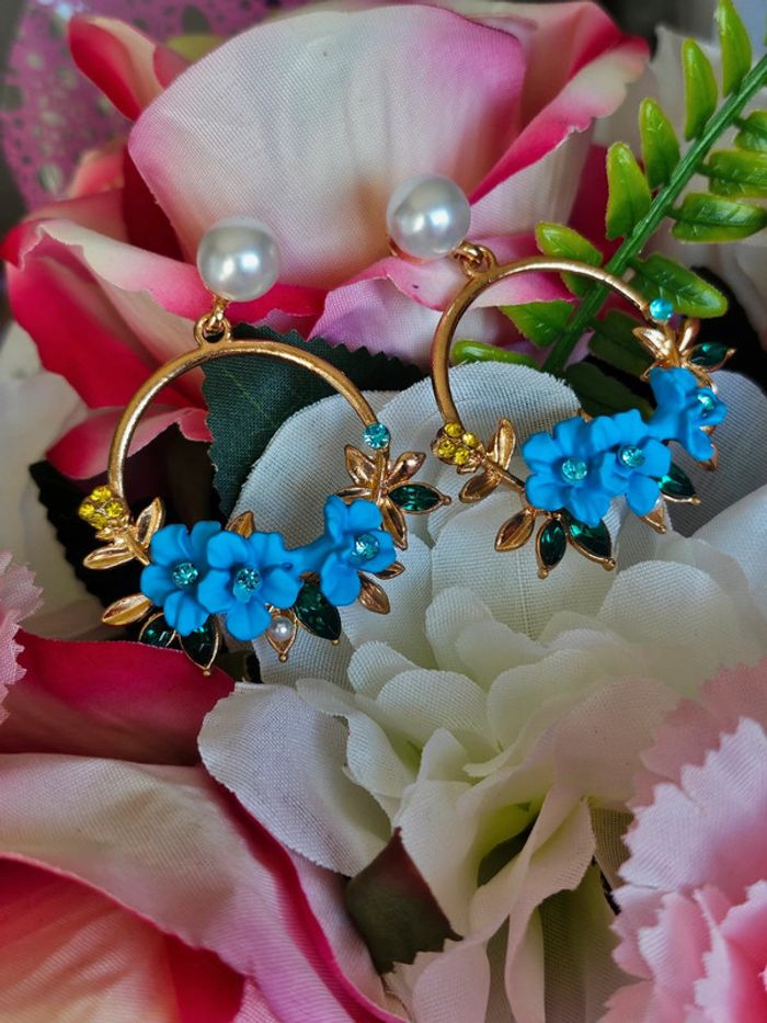 Créoles avec petites fleurs bleue, perles d eau douce et topaz multicolore