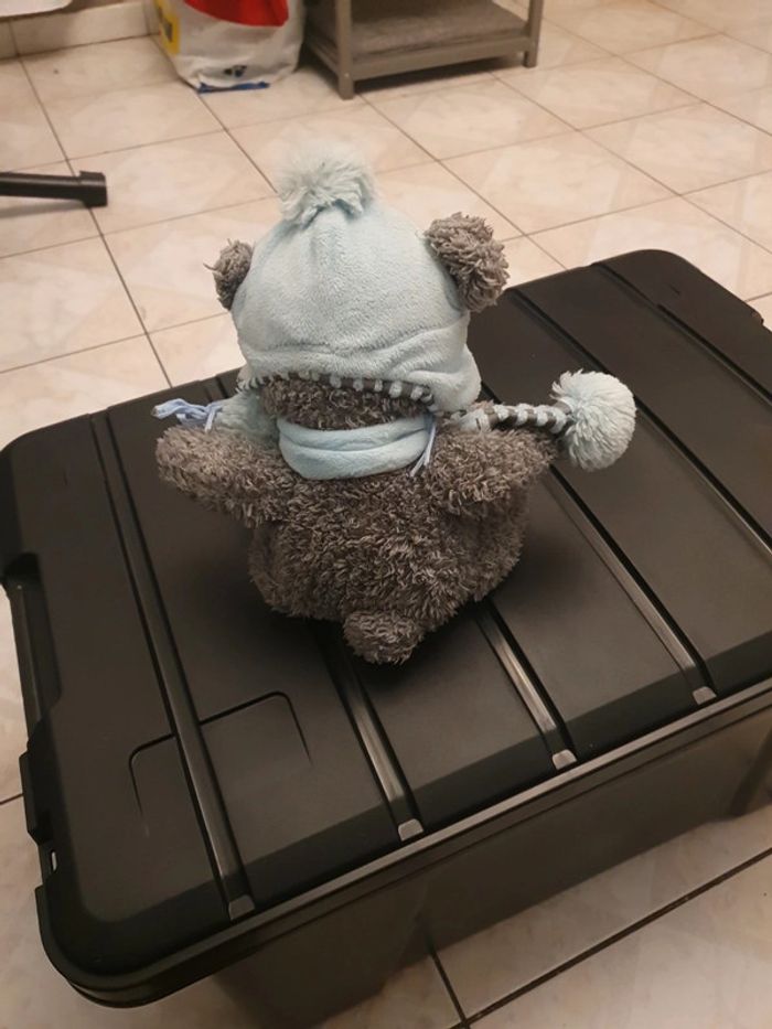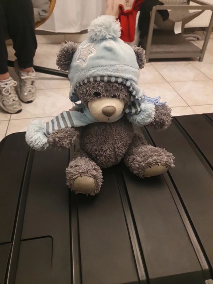 Peluche ours gris avec bonnet et echarpe bleu et gris