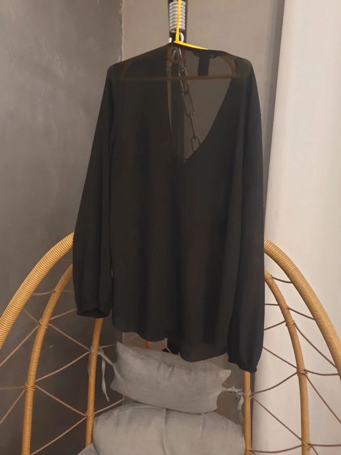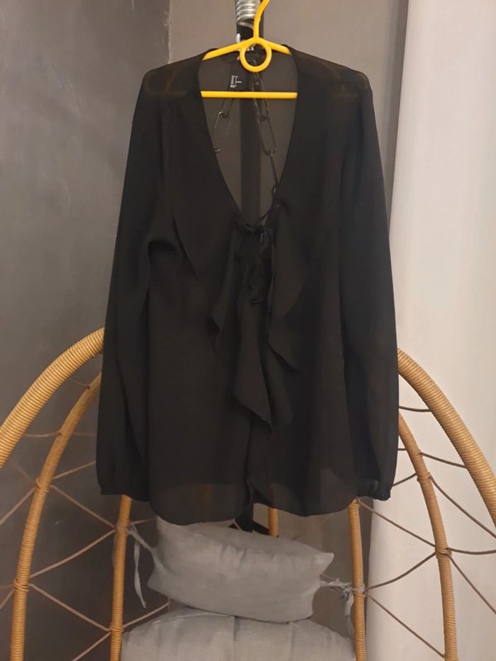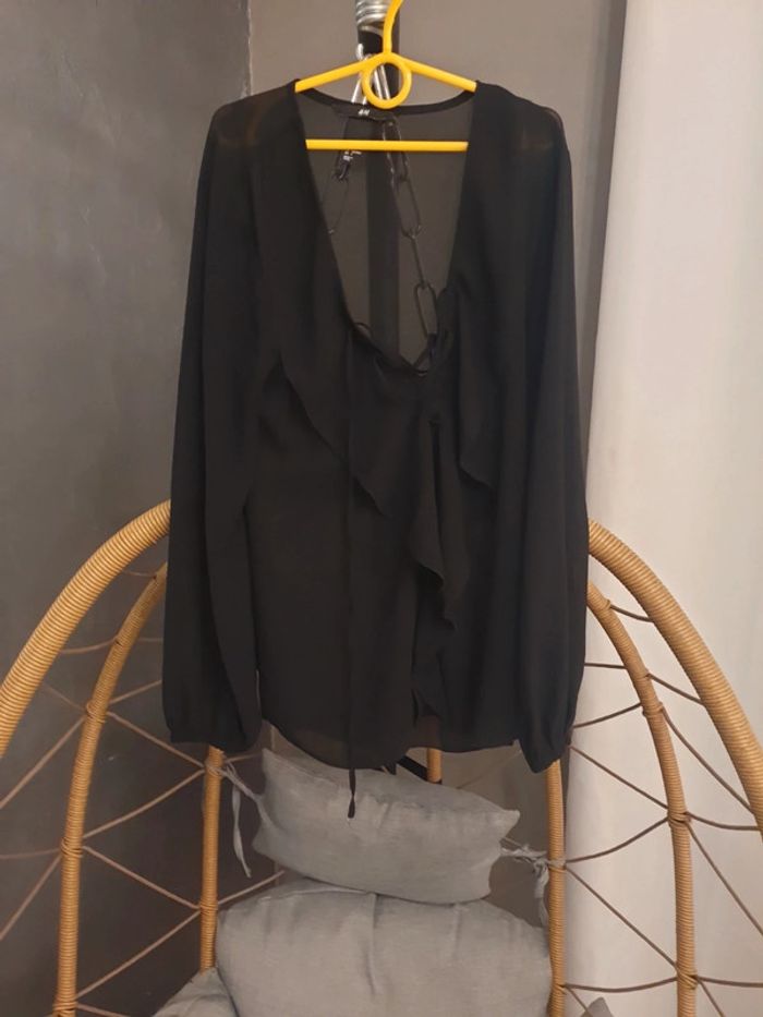 Blouse noire manche longue avec lacage sur le devant et un volant le long du décolleté manche elastique sur le bas
