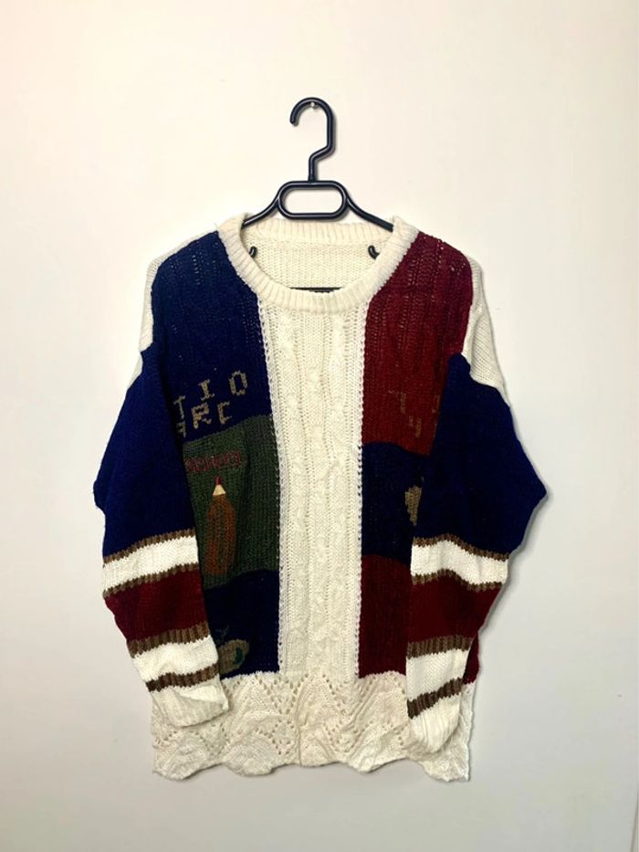 Pull d’hiver style motifs écoliers knitted brodé vintage - photo numéro 1