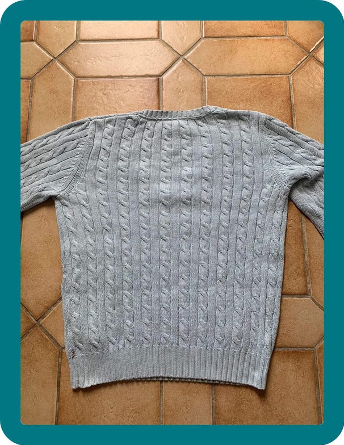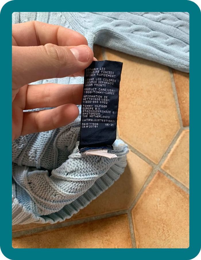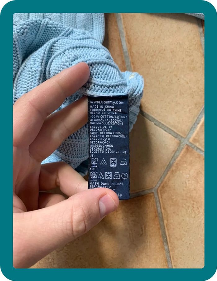 Produit : Pull col V Bleu clair / turquoise Tommy Hilfiger. Bandes torsadés. 100% coton Marque : Tommy Hilfiger Taille : L État : Très bon état (petit taches non visible sur le col , voit photo)