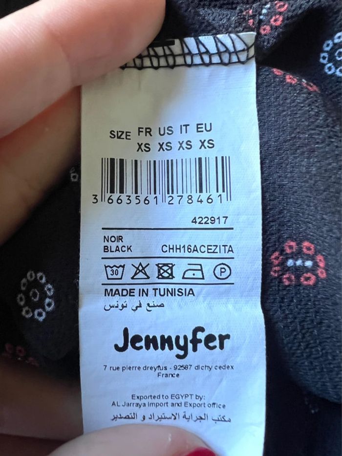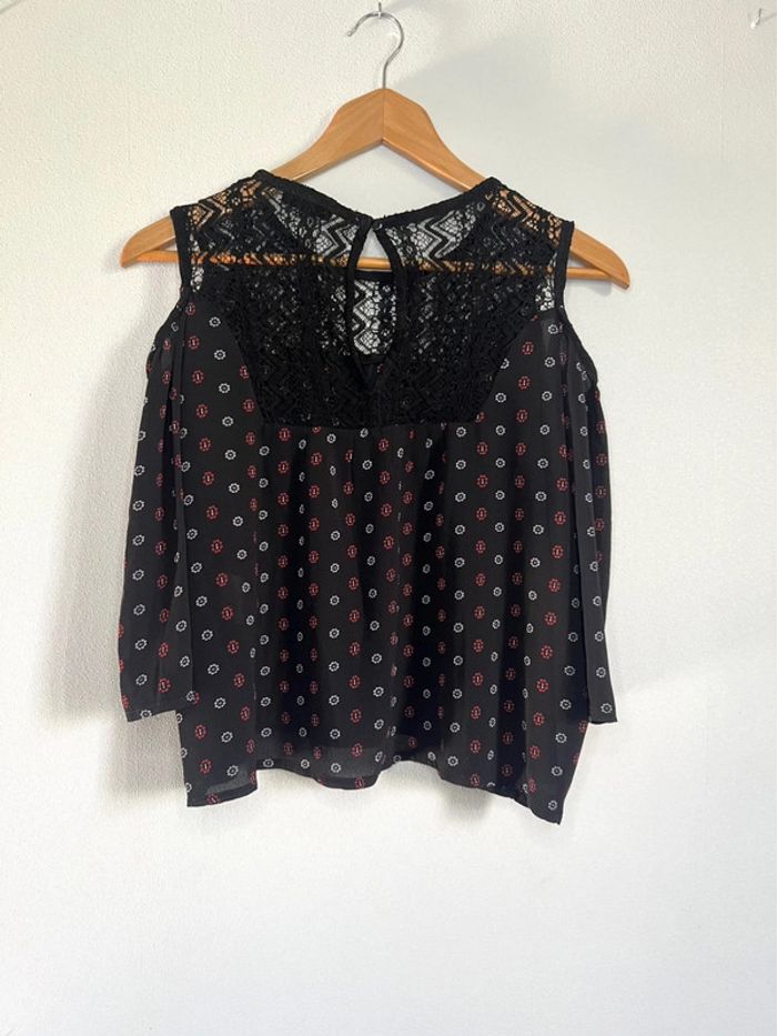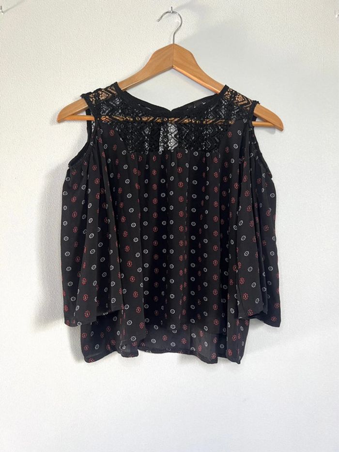 Blouse manches 3/4 épaules dénudées, taille XS / 34, couleur noir à motifs blanc et rouge, marque Jennyfer, portée très peu de fois, en parfait état Les réductions sur les lots sont activées automatiquement J’accepte toutes vos offres, je dois me débarrasser de l’ensemble des vêtements