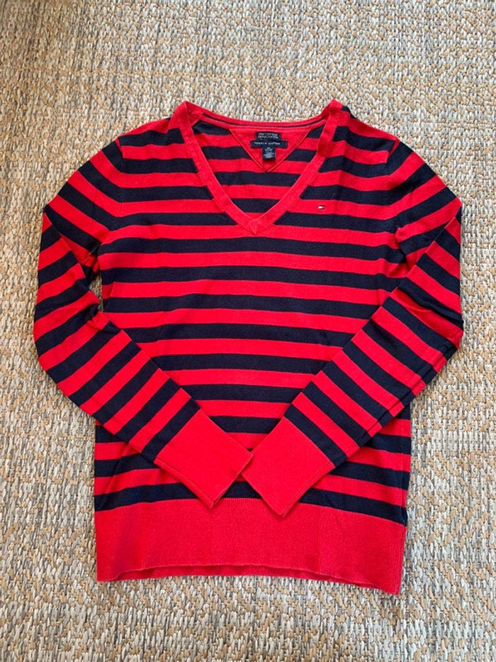 Pull / sweat col V Tommy Hilfiger style marinière bleu Marine rouge taille XS - photo numéro 1