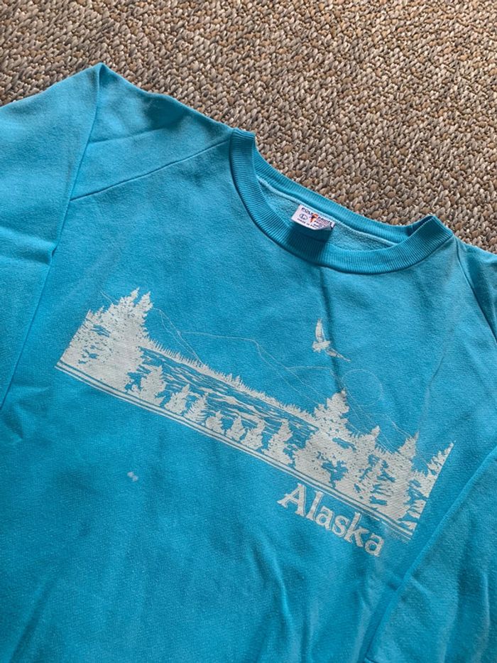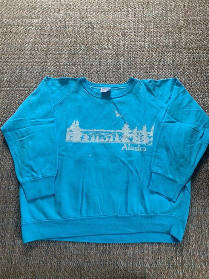 Produit : Pull sweat crewneck poly print souvenir voyage alaska vintage 1983 Marque : poly print / vintage dressing Taille : L État : Très bon état (tache voir photo)