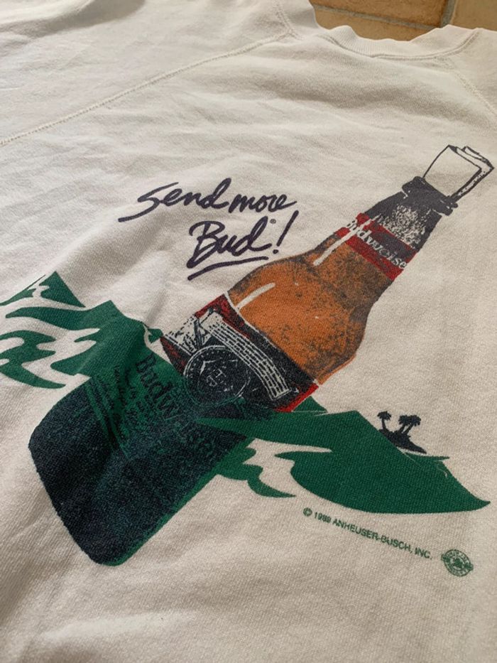 Produit : Crewneck sweat unisexe Tultex vintage Bud / Budweiser made in USA année 1989 printed / imprimé « stranded » « send more bud » Marque : Tultex / vintage dressing Taille : Large État : Très bon état (quelques défauts à cause de son ancienneté)