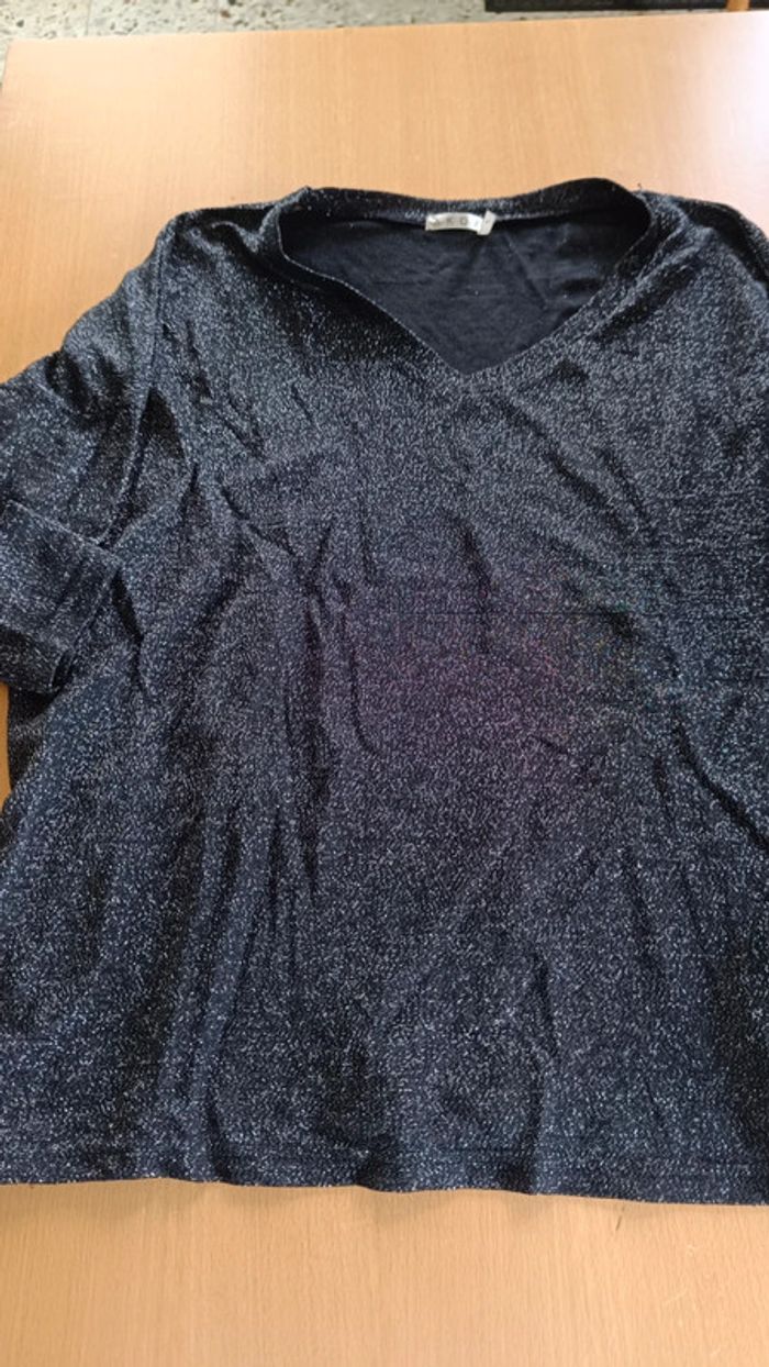 Haut manches 3/4 Noir à paillettes Col V Taille 38 100% polyester #hautmanchestroisquart #noir #paillettes #38 #femme #marylene025femme38