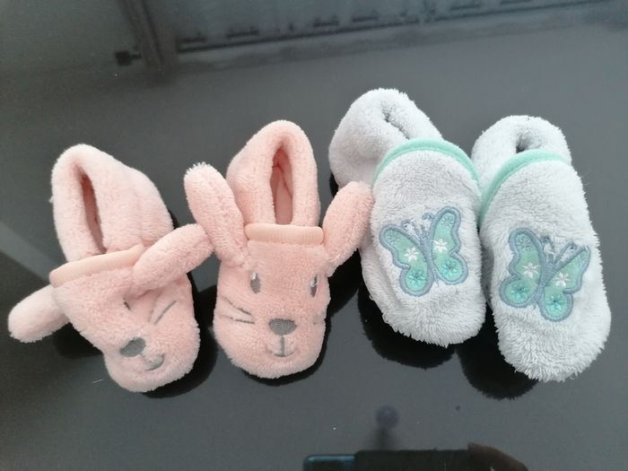 2 paires de chaussons fille taille 6/9 mois. Très bon état.