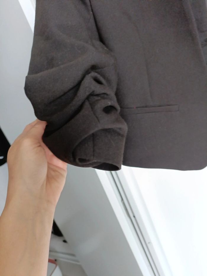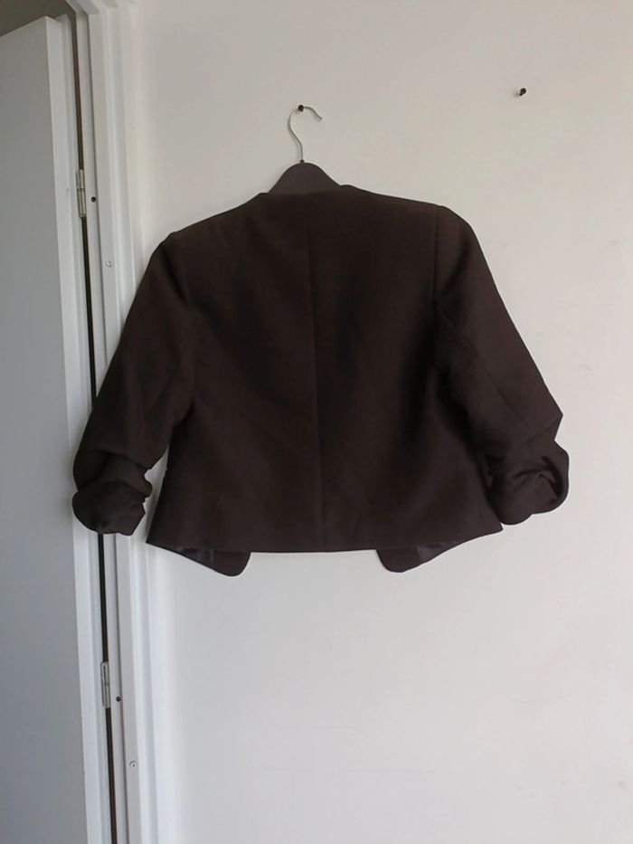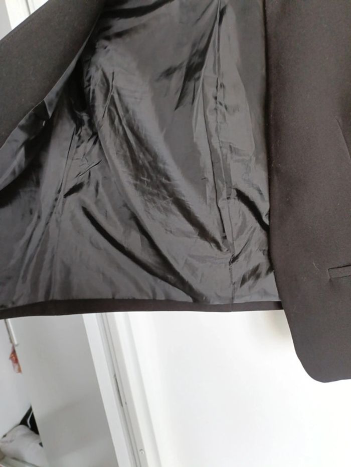 Veste intemporelle et élégante, parfaite pour compléter une tenue chic ou casual. Manches 3/4 retroussées pour un style moderne et décontracté. Taille : 36 Couleur : Noir Matière : Polyester, viscose et élasthanne pour un tombé fluide et confortable État : Très bon état (une toute petite tache minuscule, voir photo). Aucun trou ni défaut majeur. Facile à assortir, idéale pour le bureau ou une sortie habillée !
