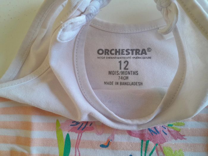 Bonjour, Je vous propose ce joli débardeur avec dessin de flamant rose, léger et confortable. De la marque Orchestra, 97 % coton et 3 % élasthanne. Taille 12 mois. Il est en très bon état. Prix 3 euros.
