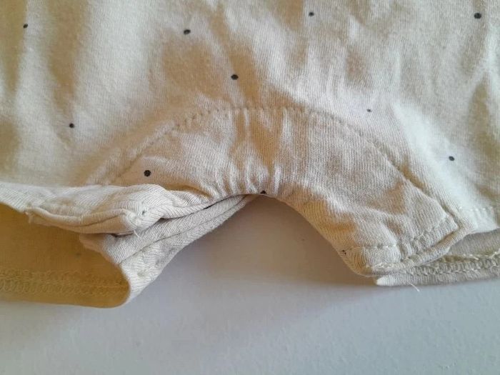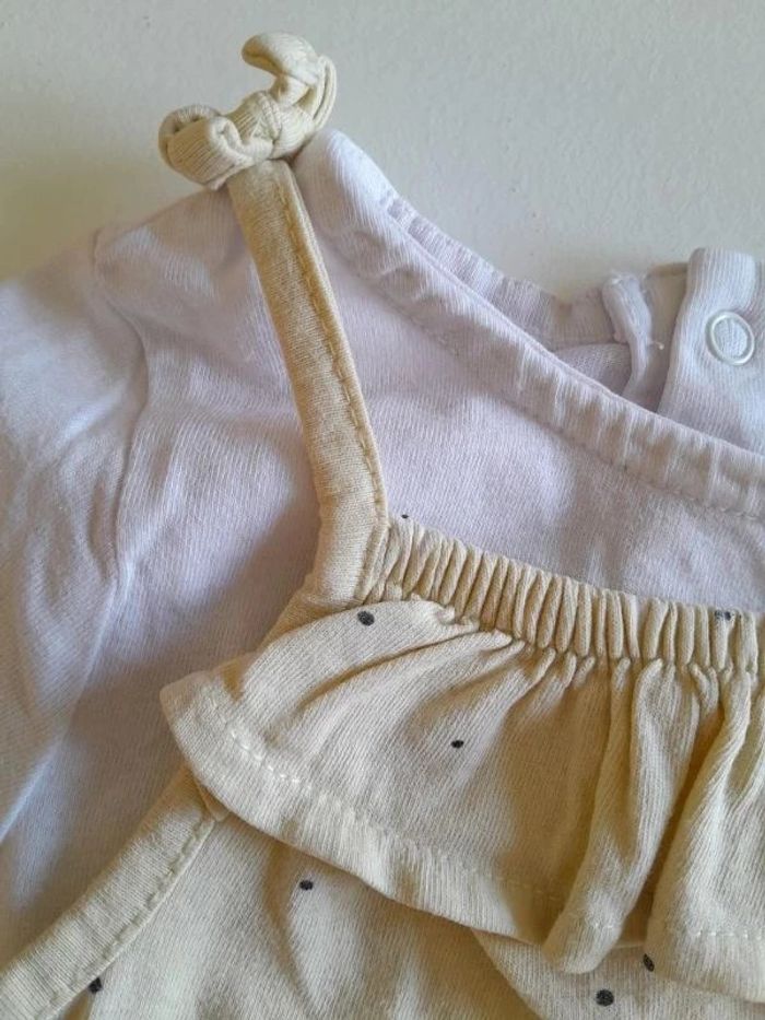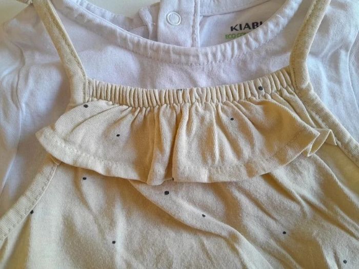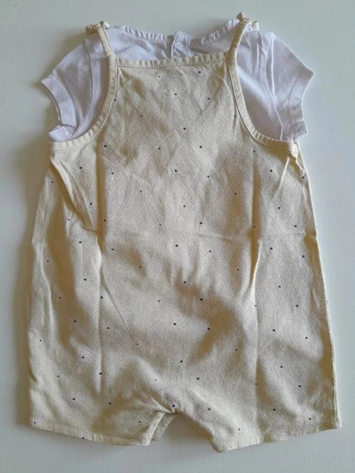 Bonjour, Je vous propose cette joli combinaison short jaune avec son tee shirt blanc. Fermeture par pressions entre les jambes pour faciliter le change. Tenue légère pour l'été. De la marque Kiabi, la combinaison et le tee shirt sont 100 % coton. Taille 12 mois. Pas de trous, pas de tâches. Prix 2.5 euros