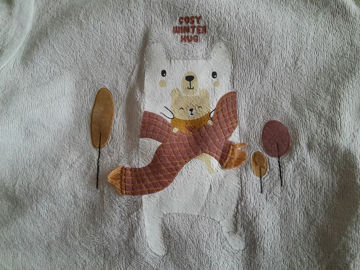 Bonjour, Je vous propose ce joli pyjama dors bien en velours beige, fermeture pression dans le dos. De la marque Kiabi, 75 % coton et 25 % polyester. Taille 9 mois. Bon état. Prix 2 euros.