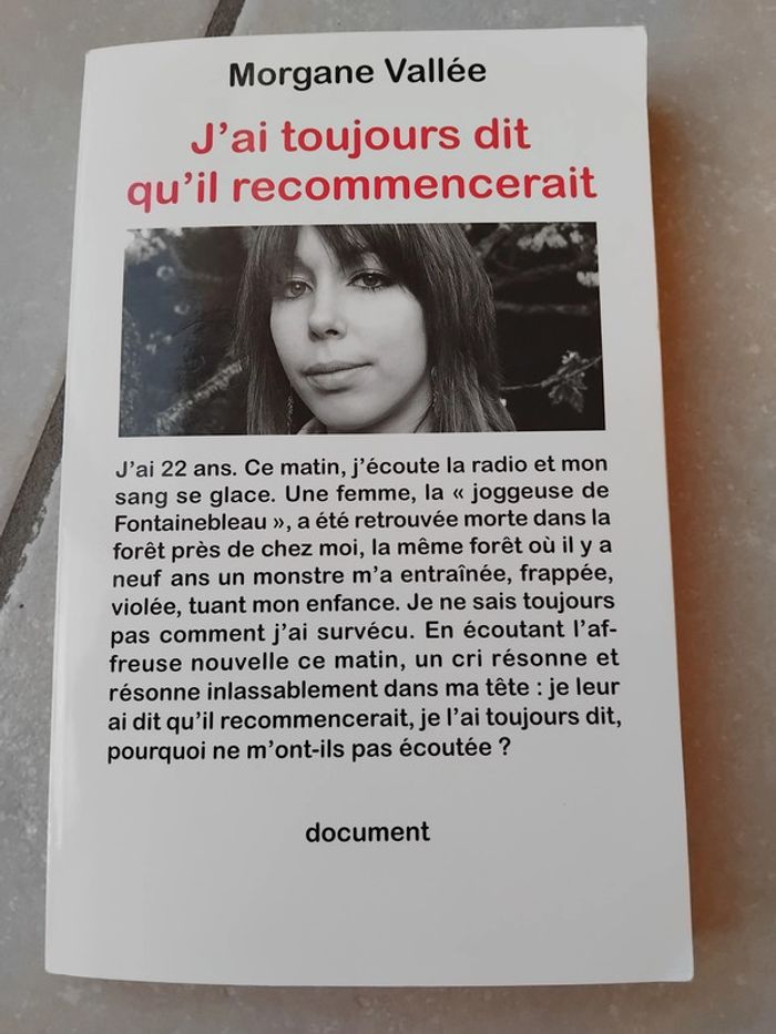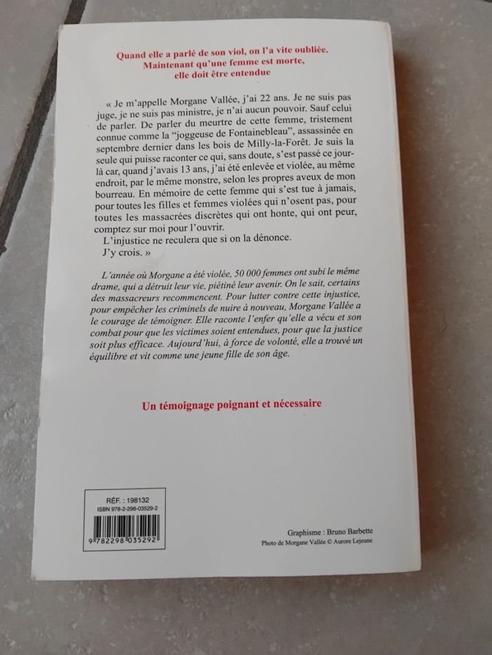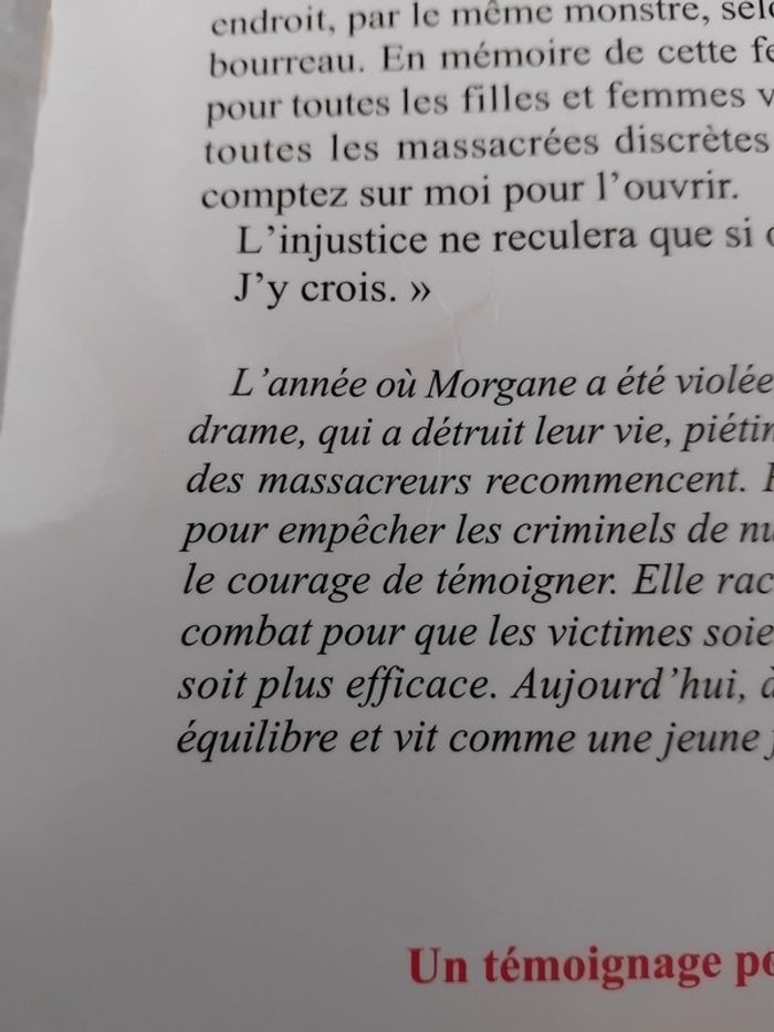 Bonjour, Je vous propose ce livre un document sur le témoignage poignant de Morgane VALLEE, sur l'enfer qu'elle a vécue. Des éditions de Noyelles. Il est en bon état, présente des défauts au niveau de la couverture pliure dans le coin supérieur, de la couverture arrière et certaines pages ont été pliées. Prix 4 euros.