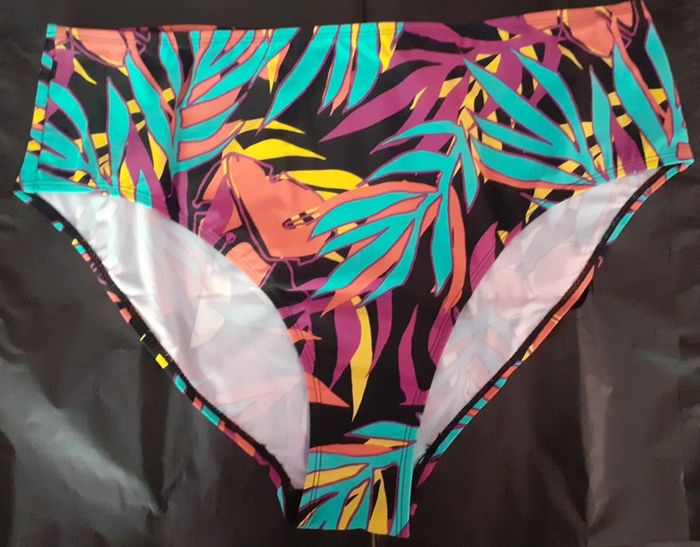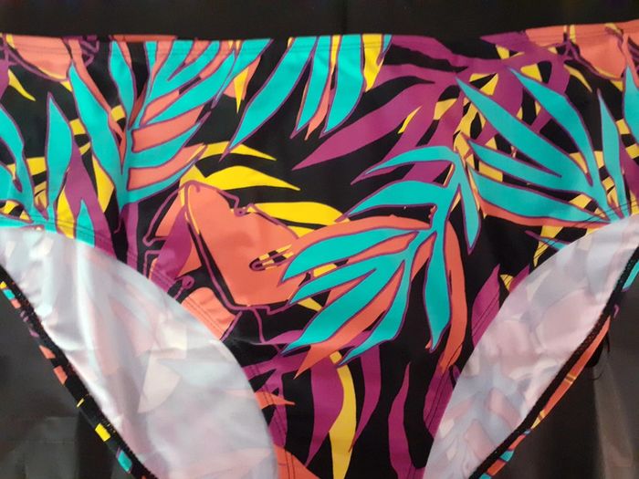 Culotte maxi imprimé tropical - Imprimé tropical tendance - Un renfort en tulle gainant qui dessine un joli ventre plat - Une taille haute qui minimise les rondeurs en adoptant un air rétro - Finition double aiguille à la taille et aux cuisses. - Fond doublé maille Composition : - 80% polyamide, 20% élasthanne - Doublure tulle 90% polyamide, 10% élasthanne. Taille : 48 Coloris : imprimé tropical Prix : 9€ Neuve jamais portée #sisterkayafemmet48 #sisterkayamaillotdebain Réf : à.ii +1