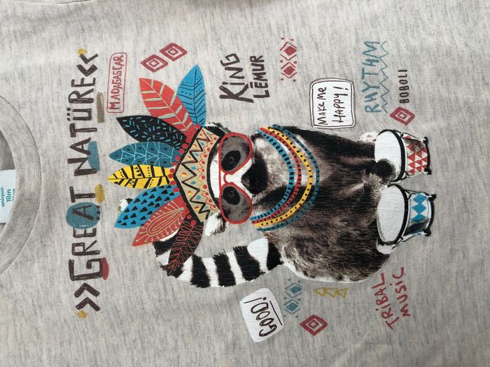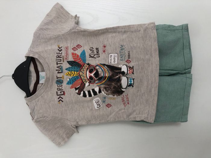 Ensemble garçon, 2 pièces, composé d'un tee-shirt et d'un short élastiqué à la taille (en coton et lin) Motif lémurien rigolo Marque Boboli (haut) et Mayoral (bas) Taille 18 mois, 86 cm