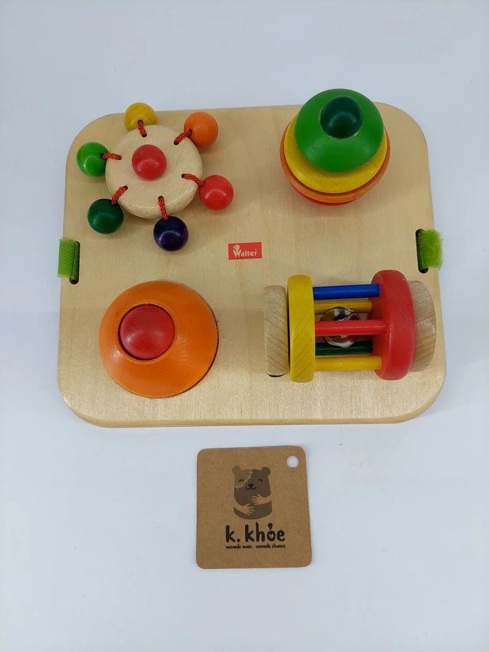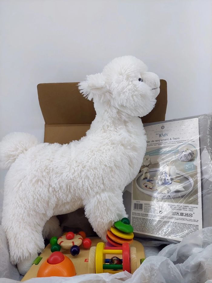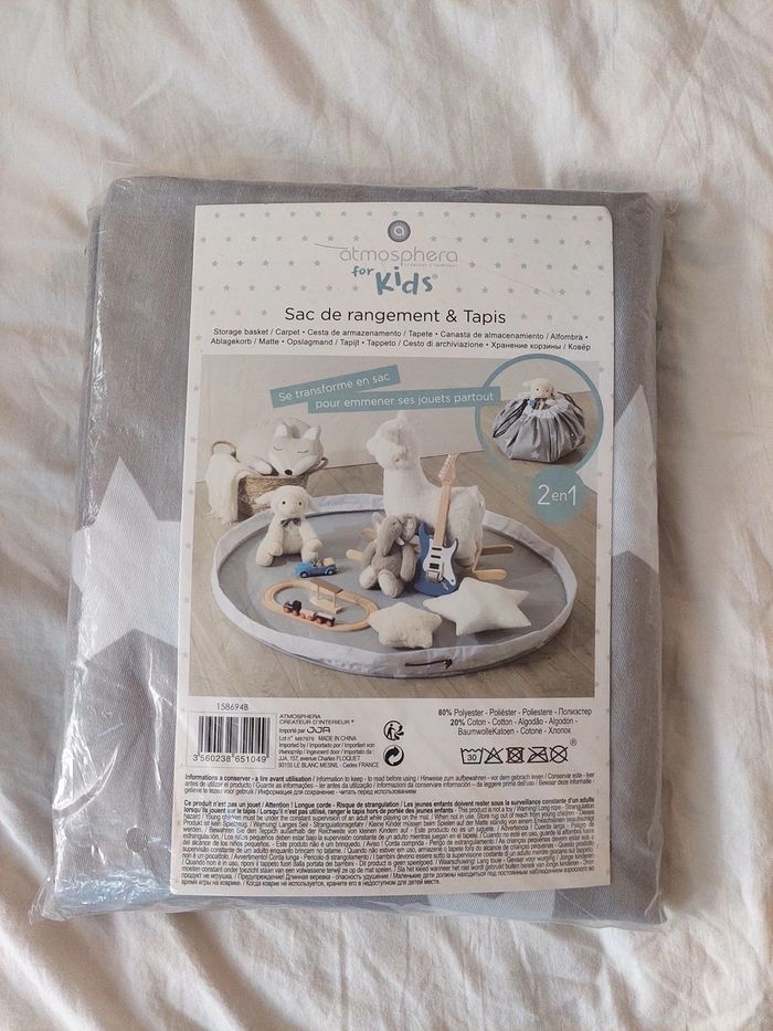 - Sac de rangement et tapis: Marque: atmosphera 2 en 1 Tapis de jeux et Sac de rangement Coloris Gris D 140 cm Dimensions : L. 140 x l. 140 cm Matière : Polyester Modèle : Gris Valeur neuf: 17 euros - Tableau d’éveil et activité en bois: Marque: Nic Walter Tableau d'activités nature, à accrocher dans le lit, le parc, ou poser sur le tapis d'éveil, pour des heures de découverte Valeur neuf: 47 euros - Peluche: Peluche toute douce lama blanc Valeur neuf: 15 euros Produits reconditionnés