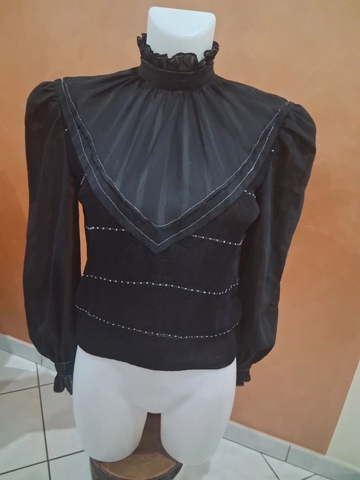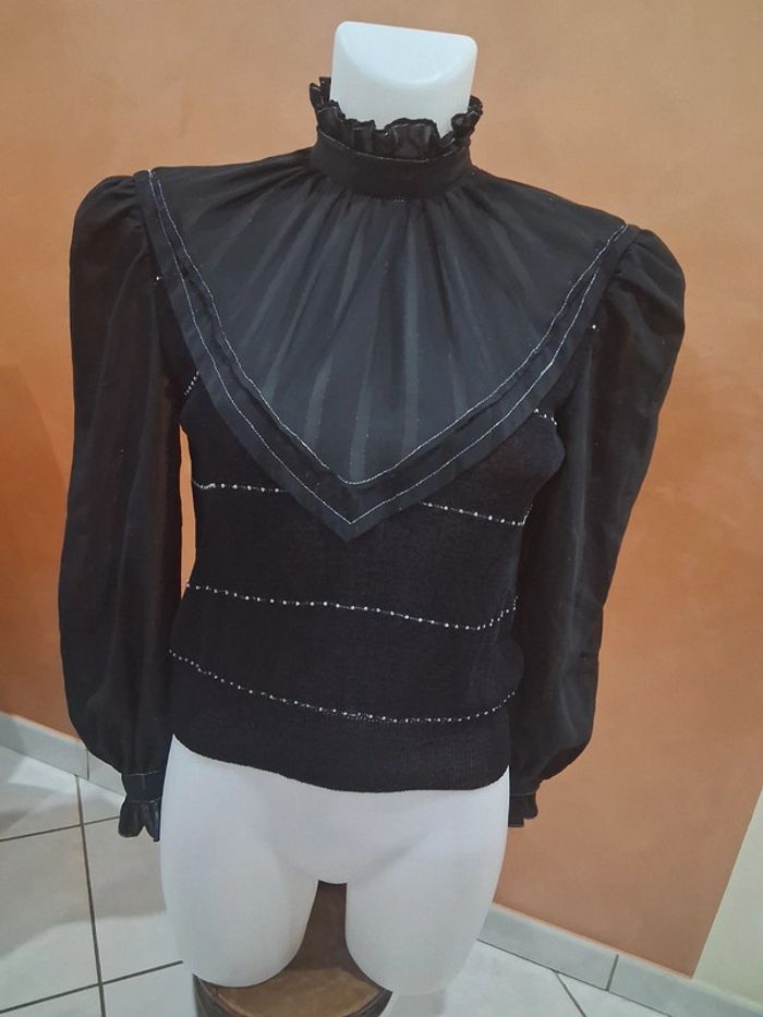 Pull habillé noir avec perles et manche transparente - photo numéro 1