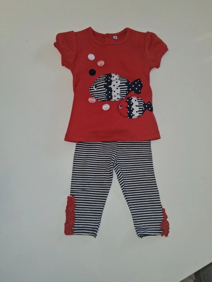 Ensemble avec T-shirt rouge thème poisson et legging à rayures - photo numéro 1