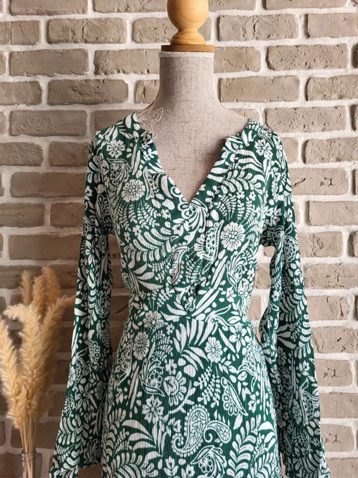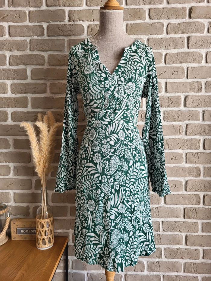 💝 Bénéficiez d'une réduction en créant lot dans mon dressing 🛍️ 🌸 Très joli robe Kiabi en parfait état 🎀 Tissu plissé avec un très bel imprimé fleuri blanc sur fond vert 🪷 Coupe courte et flatteuse légèrement cintrée et évasée Col V, manches longues avec poignets élastiqués 🍥 Taille L 40 Longueur : 90 cm 🩷 Un look bohème pour toutes les occasions et en toutes saisons