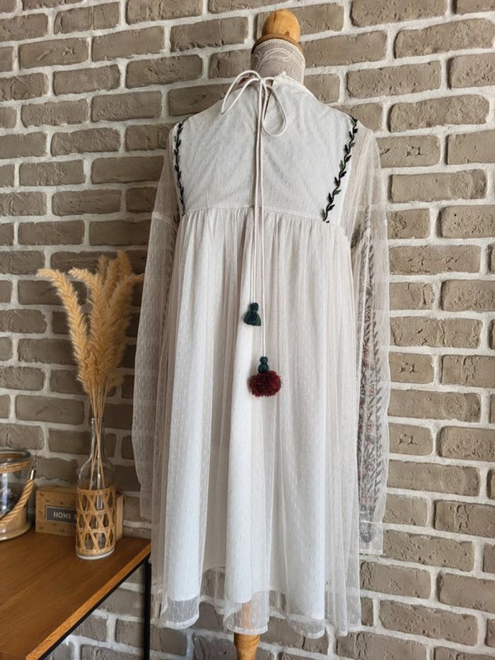 💝 Bénéficiez d'une réduction en créant lot dans mon dressing 🛍️ 🌸 Magnifique robe Zara en très bon état, sans défaut Une vraie pépite bohème et romantique 🎀 Tulle blanc cassé / ivoire avec plumetis et doublé (sauf aux manches) 🪷 Coupe courte, ample et évasée Dentelle à l'encolure et superbes broderies florales avec perles et fils dorés sur le haut du buste, sur les manches et dans le dos Liens à nouer terminés par 2 beaux pompons à l'arrière 🍥 Taille S 36 Longueur : 80 cm 🩷 Parfaite pour une cérémonie ou un look poétique au quotidien !