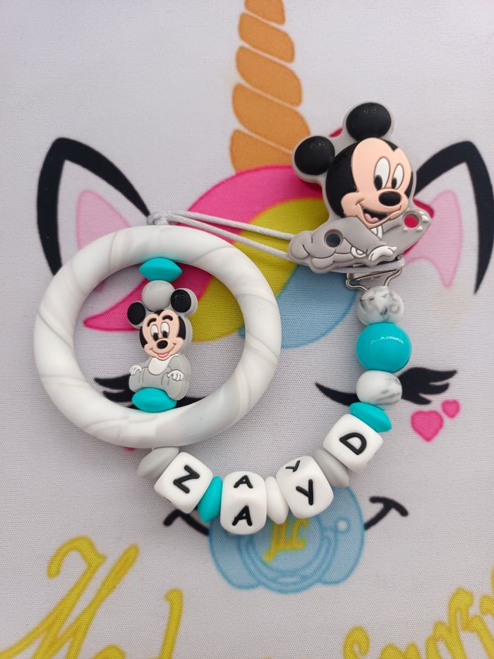 Une Attache tétine Mickey pour ne plus perdre la tétine avec une boucle pour attacher celle-ci (adaptateur MAM disponible pour les tétines MAM dans les accessoires) et un clip pour accrocher l'attache à un tissu sans l'abîmer doublé d'un anneau dentition. Respect des normes CE, composée de perles silicone alimentaire et/ou bois naturel. 100% personnalisable, énormément de choix de clips, perles, etc… Envoyez-moi un message afin de créer main dans la main votre accessoire idéal. Une photo du prototype de celui-ci vous est envoyé pour validation avant envoi.