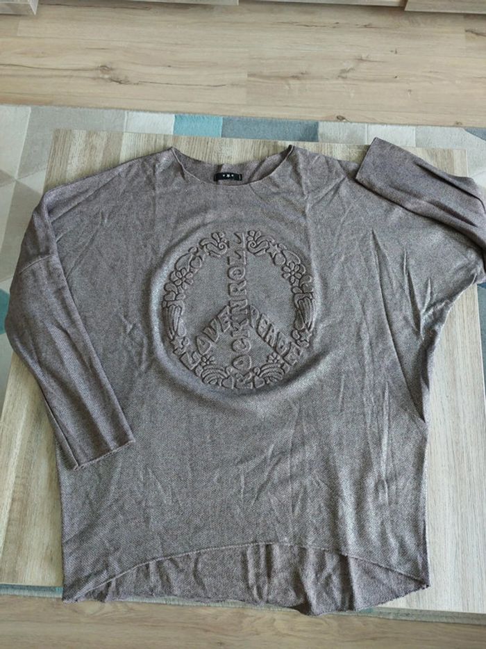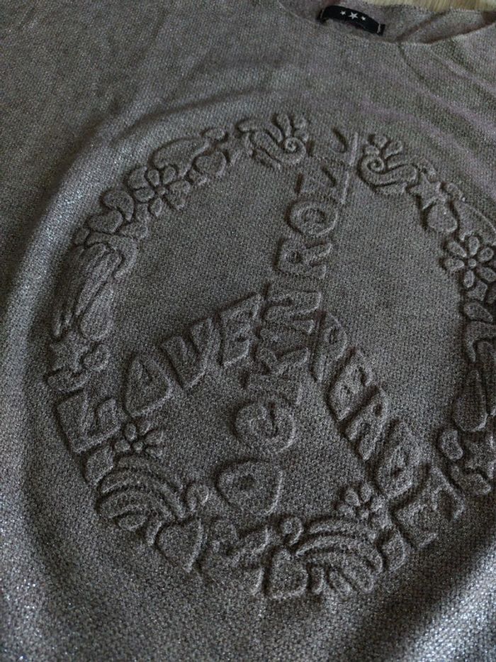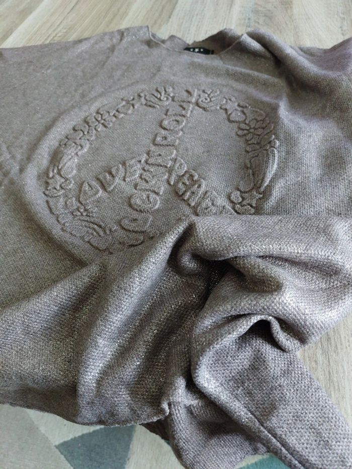 Pull marron glacé et brillant, motif peace and love en relief. Taille unique Convient bien jusque L Made in italy Porté une fois