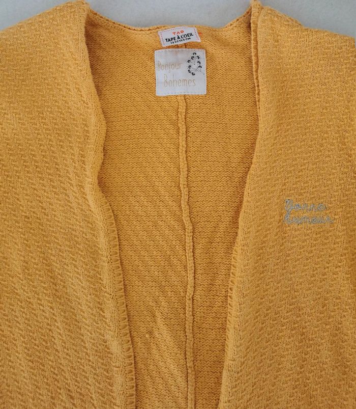 ✨ Gilet ou veste sans fermeture ✨ TAO, bonjour bohèmes ✨ 12 ans, 152cm ✨ Jaune ✨ Petite inscription argentée brodée '' bonne humeur '' devant ✨ Ourlets aux poignets Très bon état Pour une visite de mon dressing fille 12 ans, c'est ici 😉 : #stephanie89240fille12ans #giletfille #giletfille12ans #giletfilletao #ref078en #vestefille #fille12ans