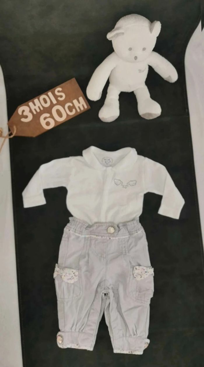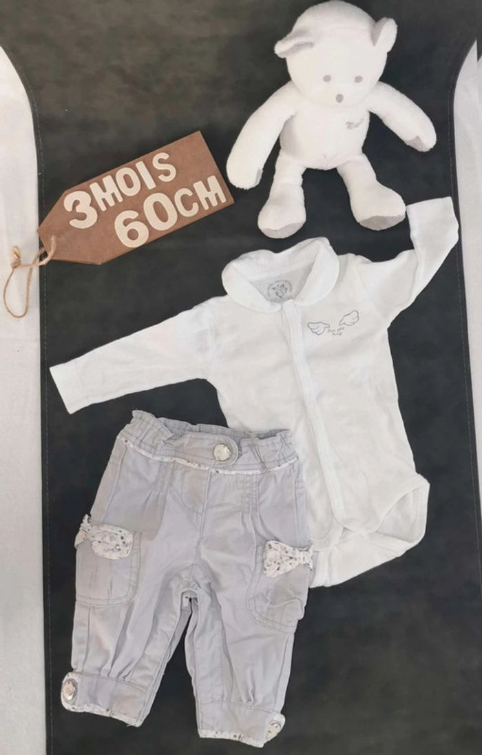 Ensemble  👣 pantalon  tape à  l'œil gris mauve  clair  avec  bodie blanc tout  simplement 3mois/60cm - photo numéro 1