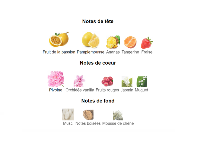 Beauty of senses eau de parfum femme 100 ml note de Tête fruit de la passion, pamplemousse, ananas, mandarine, fraise note de coeur jasmin, muguet, pivoine, orchidée vanille, fruits rouges note de fond mousse de chêne, musc, notes boisées Ce parfum est bien plus qu'une simple fragrance - c'est une expression de la confiance en soi et de la sensualité, capturée dans un mélange irrésistible de fleurs exotiques et de fruits frais. Laissez-vous emporter par le mélange enivrant de fruit de la passion, de pivoine et de vanille qui compose ce bouquet floral et fruité, pour une expérience olfactive fraîche et pétillante.