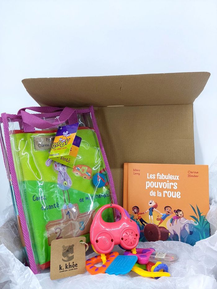 - Protège carnet de santé: Marque babymoov Neuf vendu avec pochette - Hochet clés de voiture: Âge: dès 3 mois Marque: Wonderkids Hochet avec clés de voiture coloré pour bébé, contenant 3 clés sons et lumières, doté d’un bouton on/off - Livre: Les fabuleux pouvoirs de la roue Marque: Hachette jeunesse Produits reconditionnés