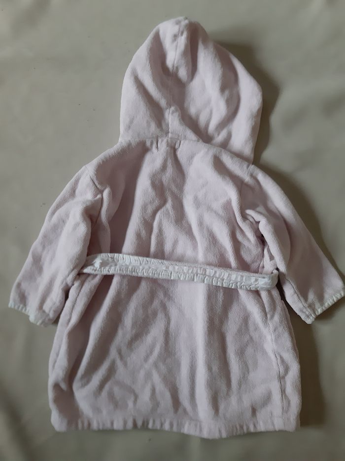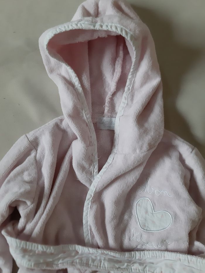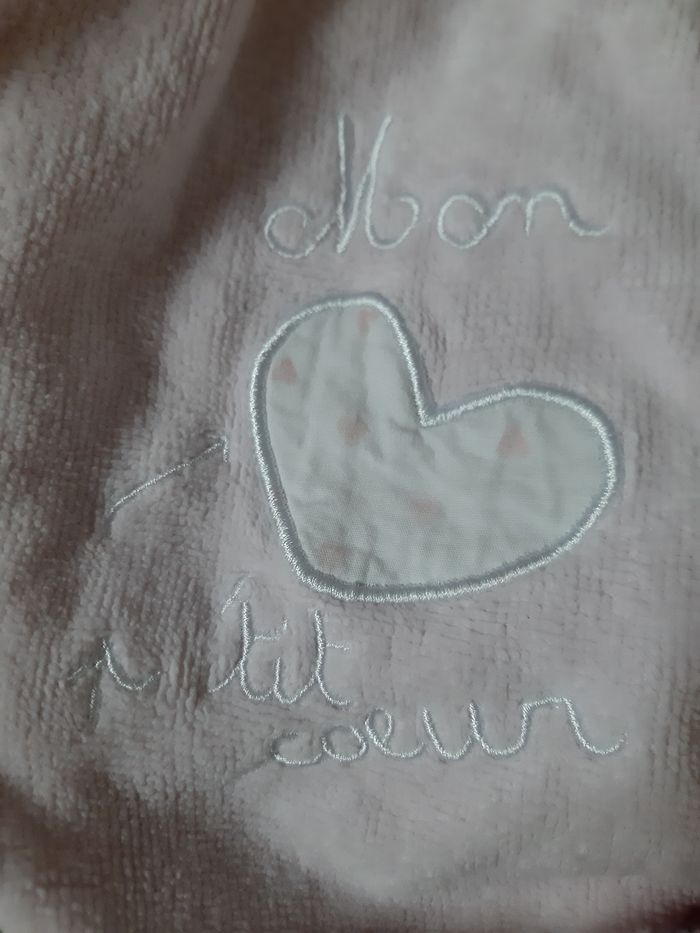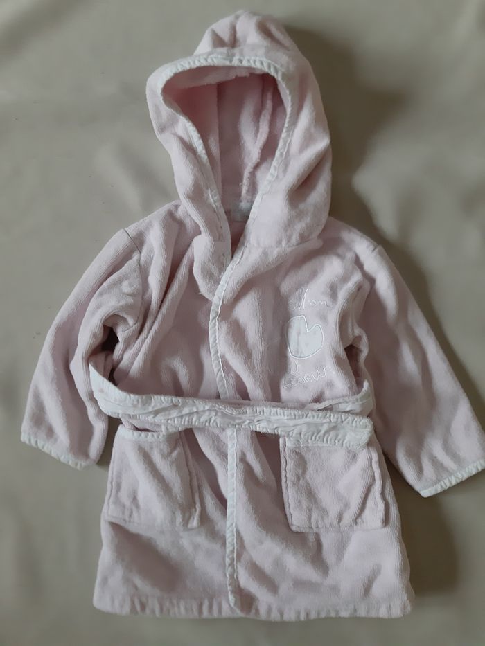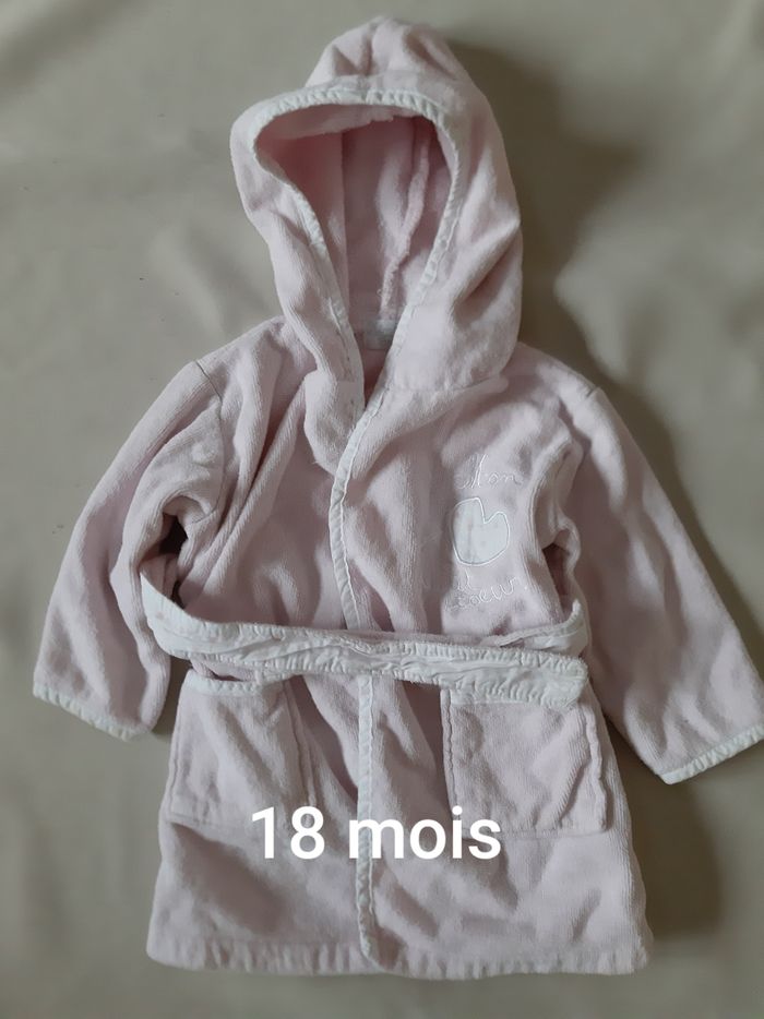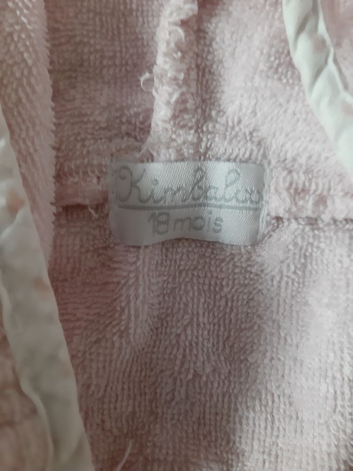peignoir de bain rose, de la marque Kimbaloo, en taille 18 mois motif : cœurs inscription : Mon p'tit cœur 2 vraies poches tissu éponge doux En très bon état.