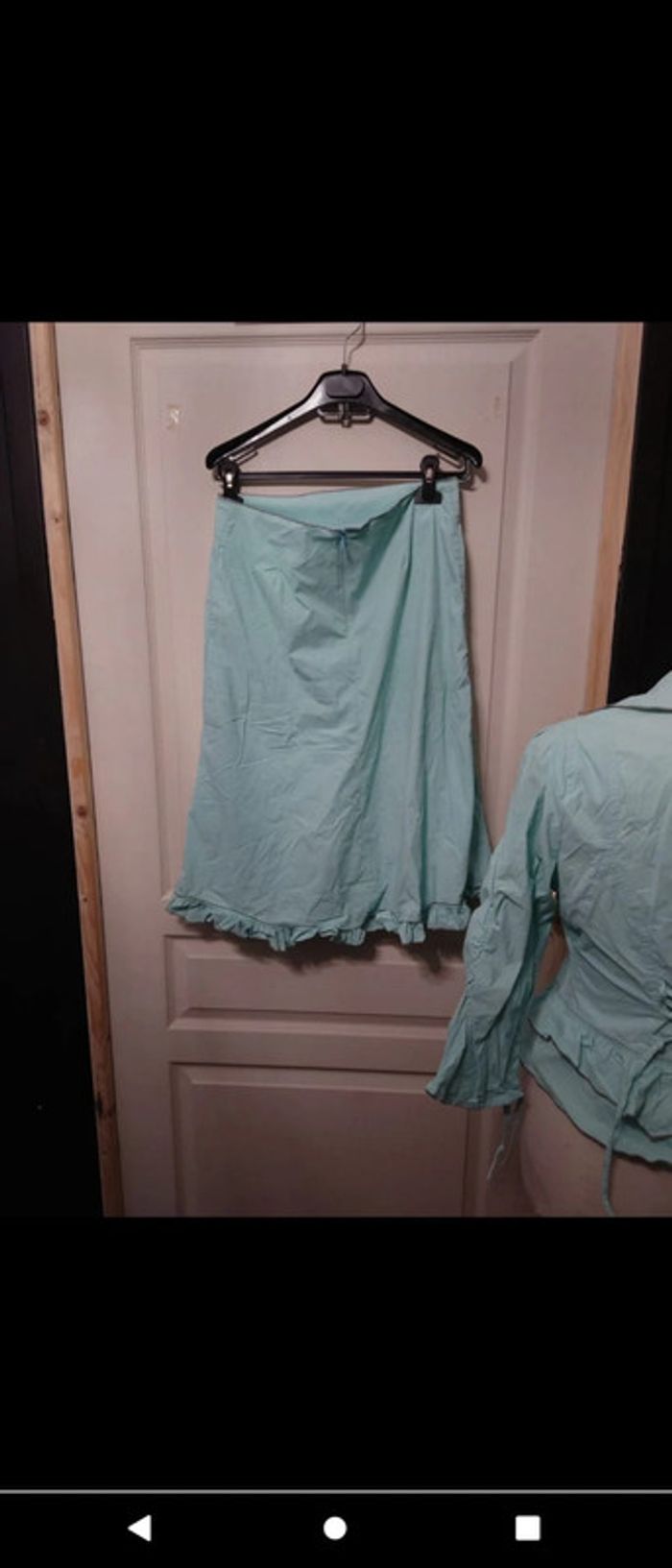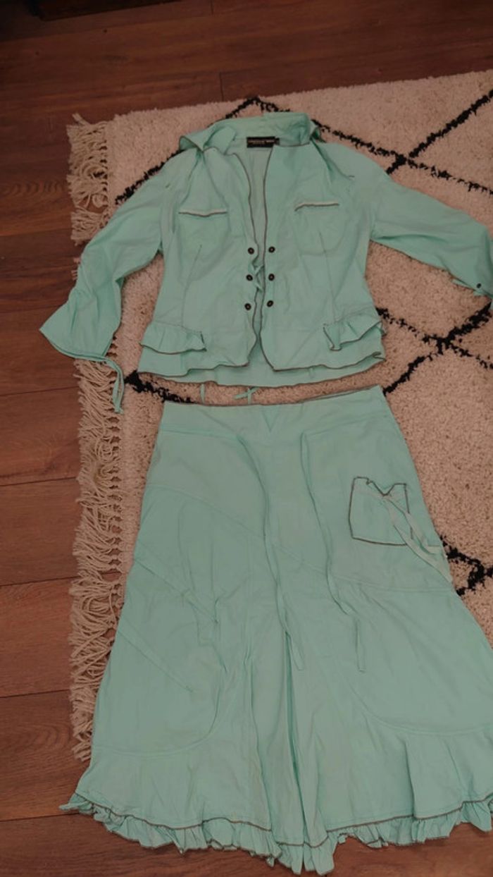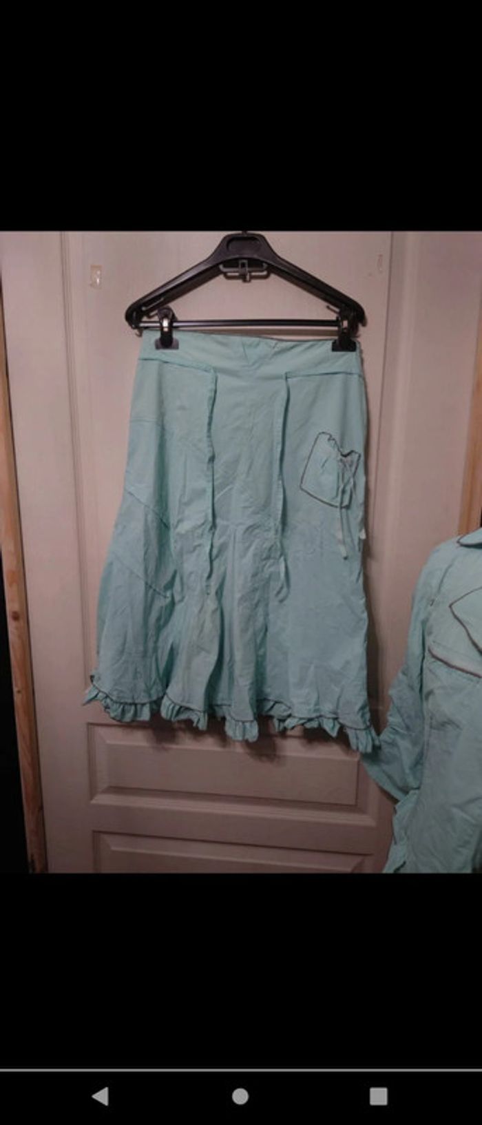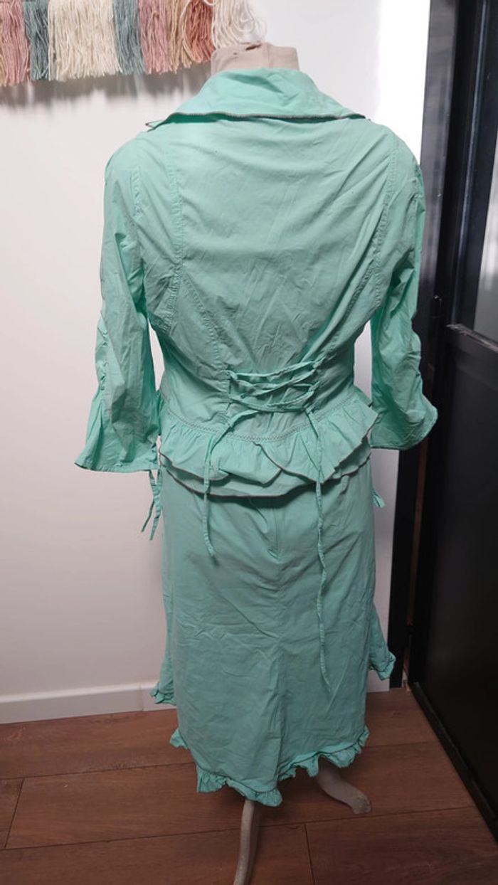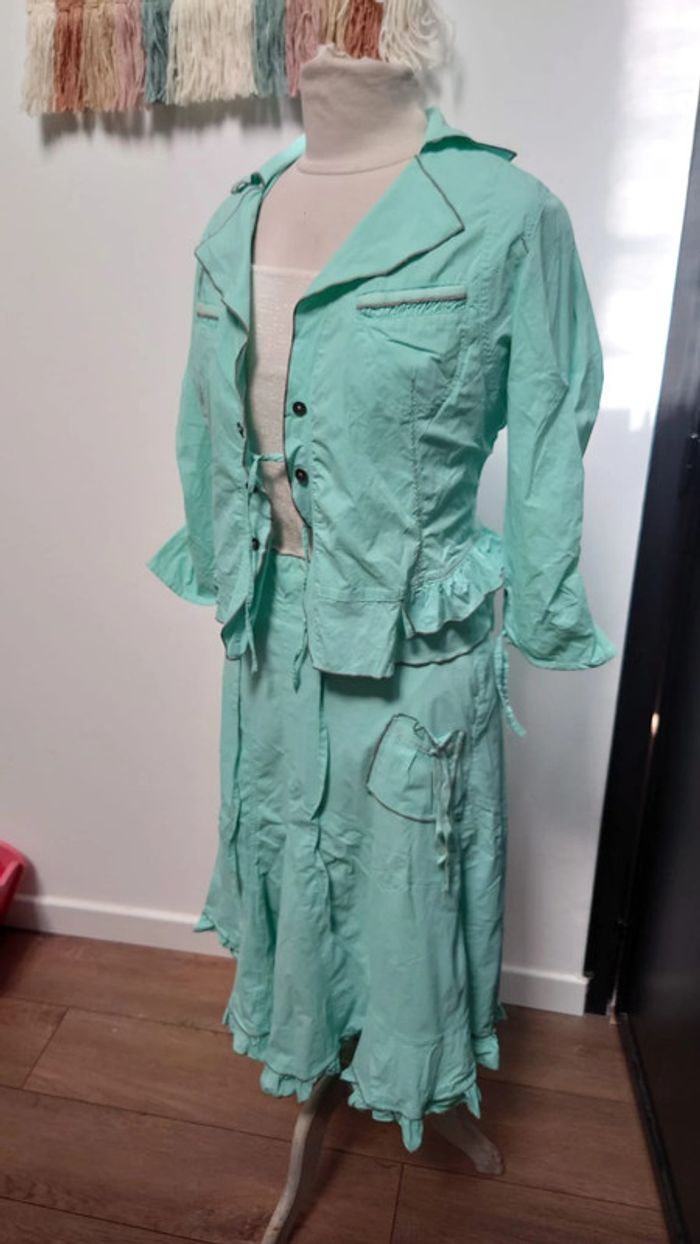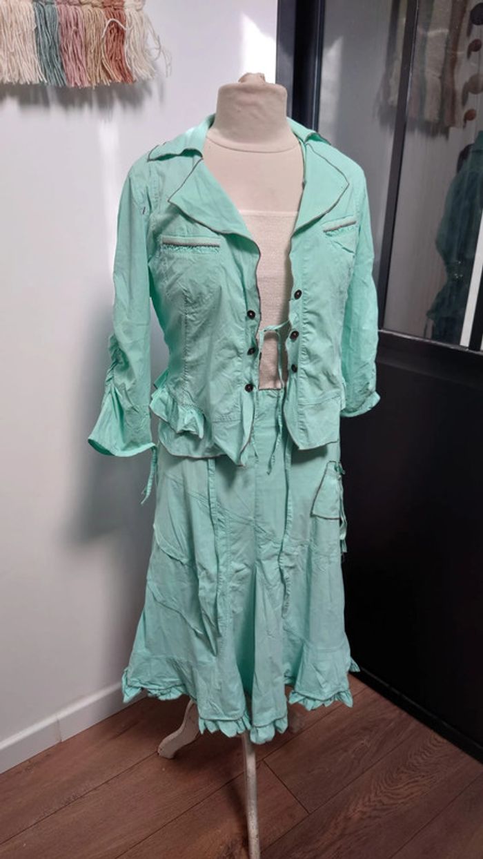 ensemble d'été composé d'une veste et de la jupe etiqueté 42 mais taille vraiment petit donc voilà la raison pour laquelle je mets 38 - 40 jupe : Taille: 38 - longueur : 67 - hanches : 63 veste : carrure : 37 - manches : 43.5 - taille : 37 parfait pour cet été, travail, soirée, bapteme, mariage , cérémonie, cocktail bleu clair style retro boheme