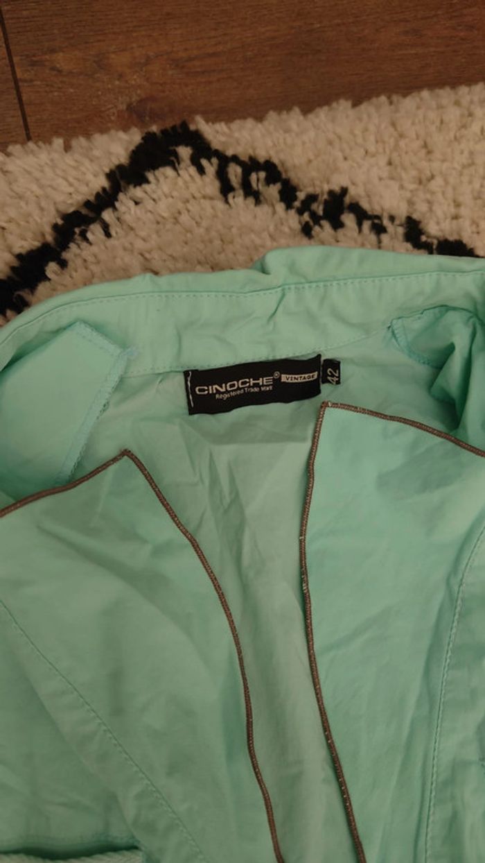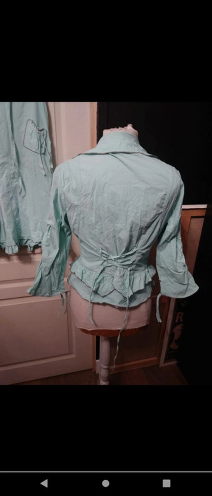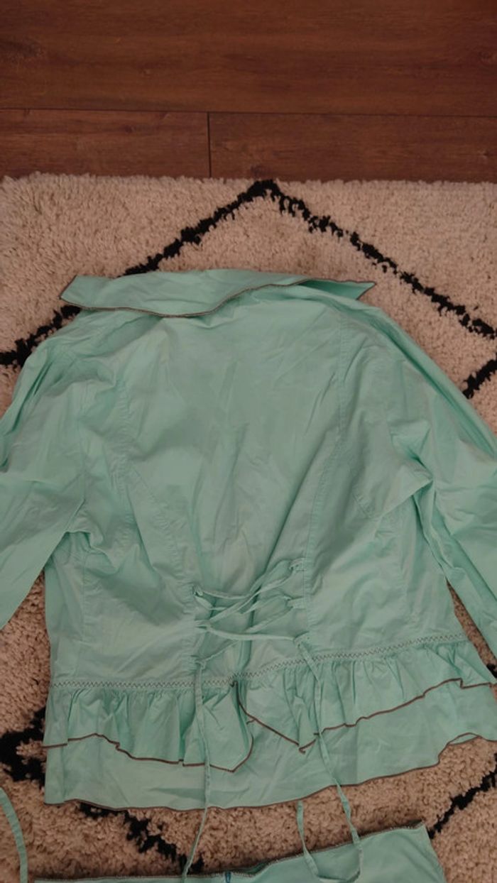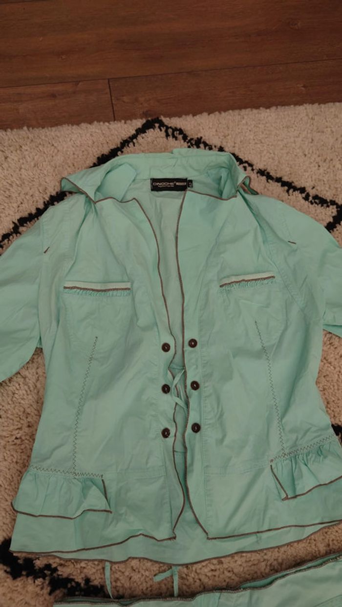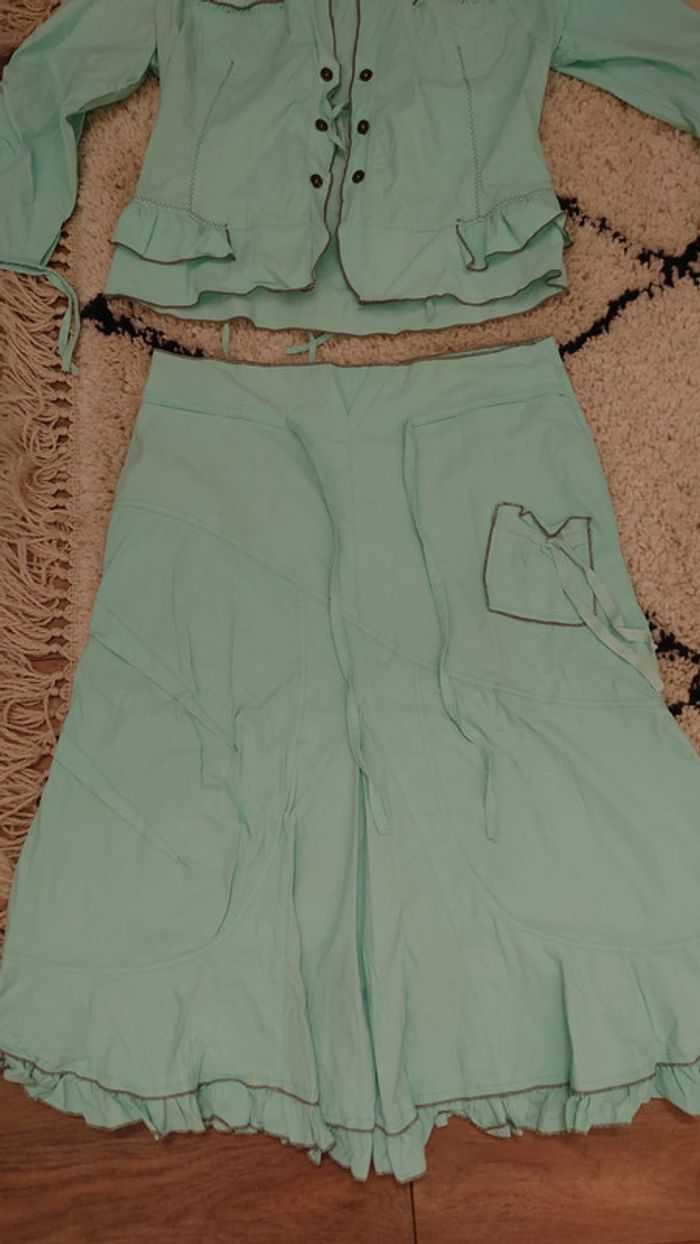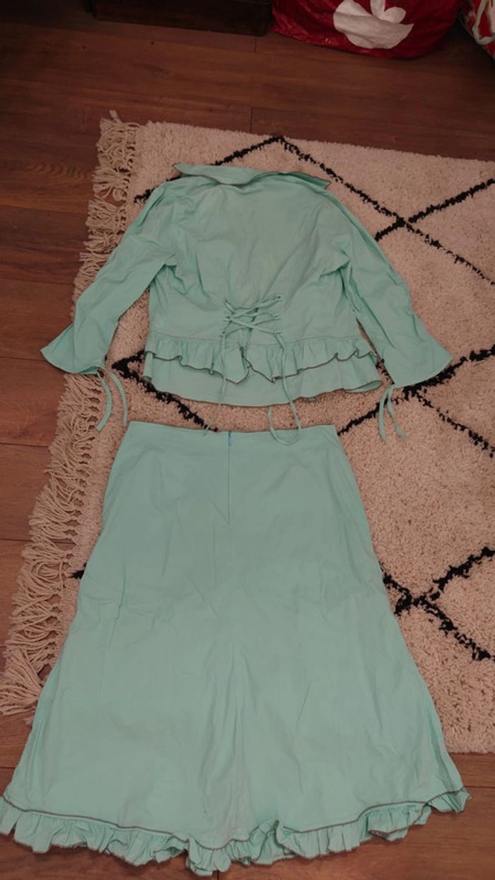 ensemble d'été composé d'une veste et de la jupe etiqueté 42 mais taille vraiment petit donc voilà la raison pour laquelle je mets 38 - 40 jupe : Taille: 38 - longueur : 67 - hanches : 63 veste : carrure : 37 - manches : 43.5 - taille : 37 parfait pour cet été, travail, soirée, bapteme, mariage , cérémonie, cocktail bleu clair style retro boheme