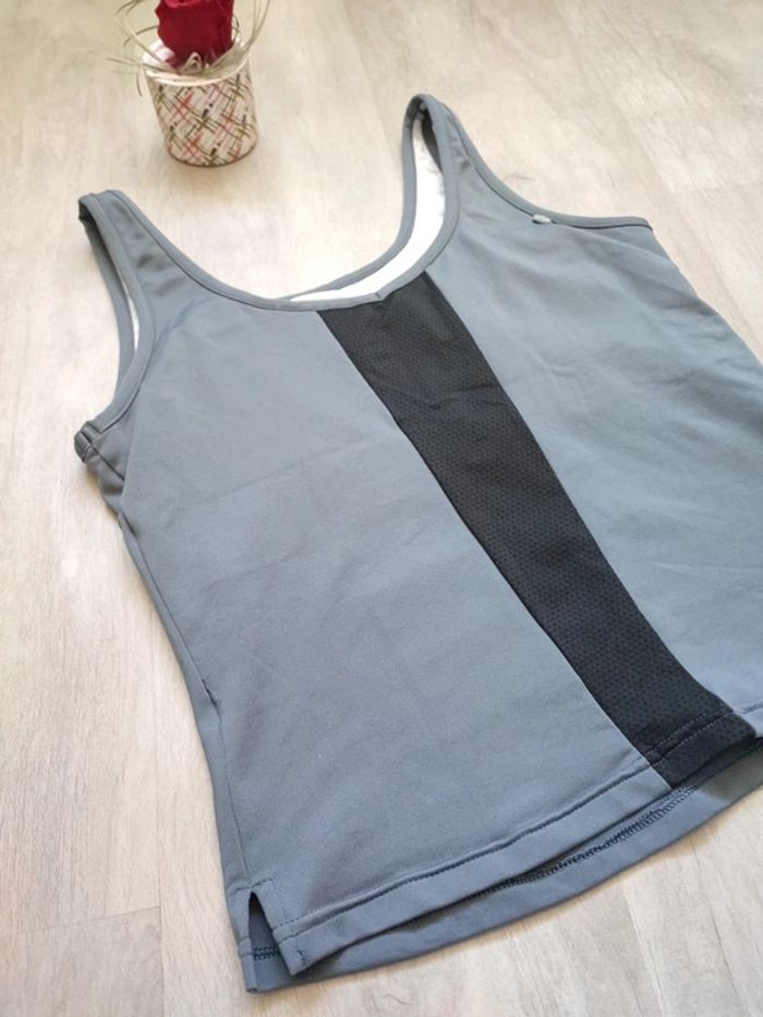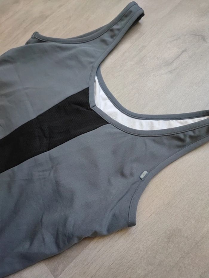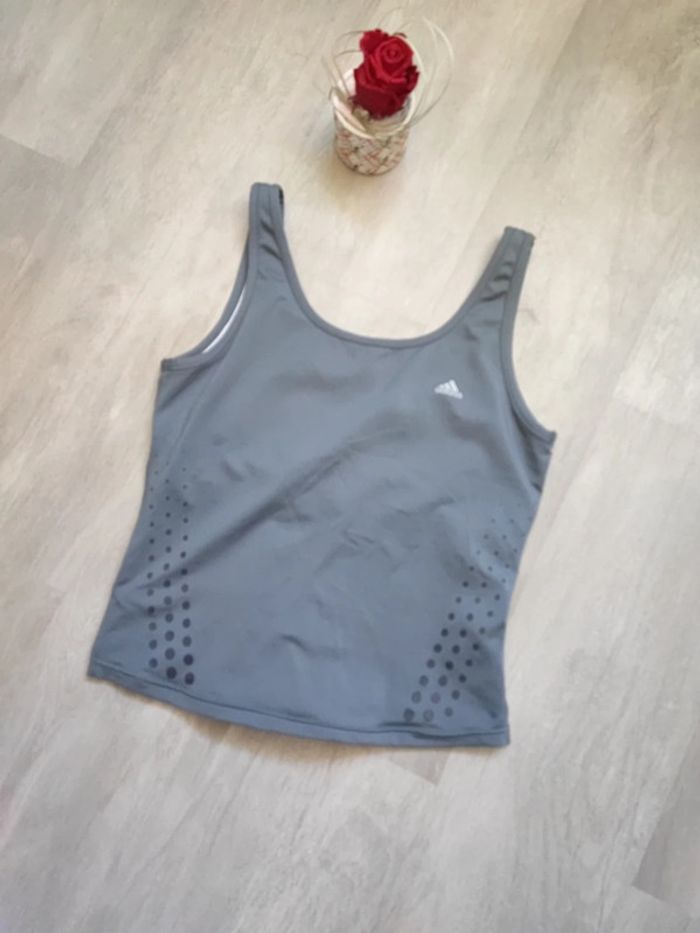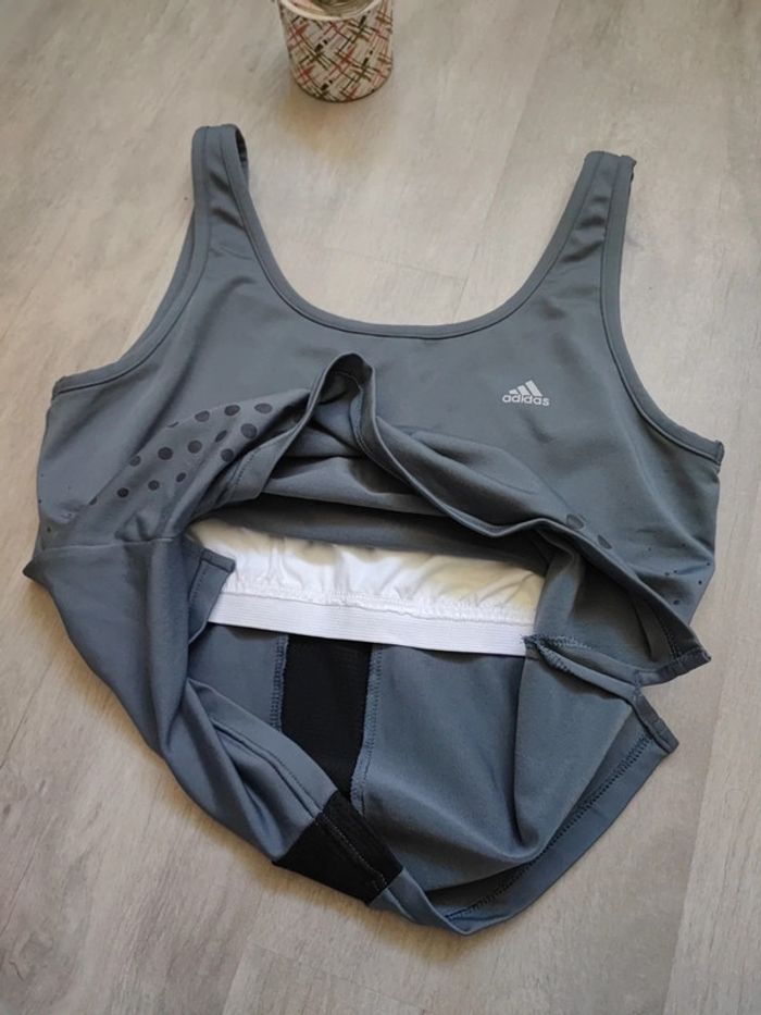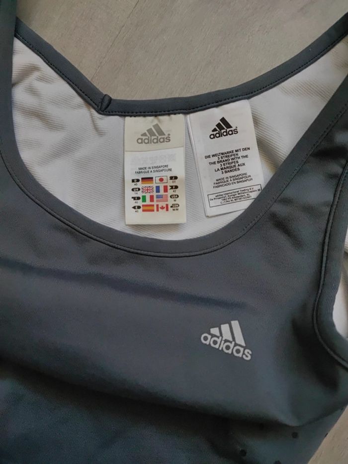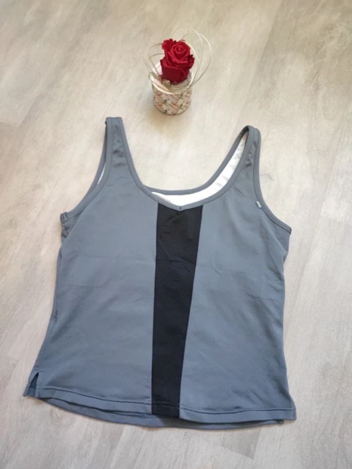 Débardeur bretelles Gris et un peu de noir Brassière intégrée Décolleté devant et derrière (pointé derrière) Marque Adidas, authentique Taille 42 Bon état #cyboulette44femme