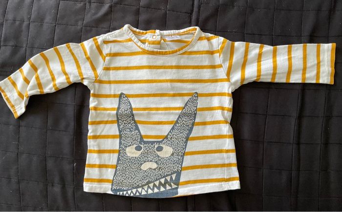Tee shirt à manches longues avec 3 pressions dans le dos Beige avec rayures moutarde 100% coton Taille 9 mois (71 cm)