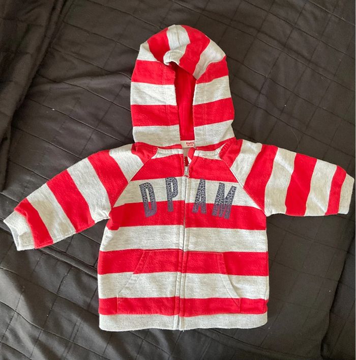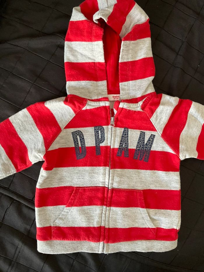 Veste à capuche rouge et grise Fermeture par zip 2 poches sur le devant Logo DPAM « craquelé » mais comme c’est uniform, ça ne choque pas. 6 mois (67 cm)