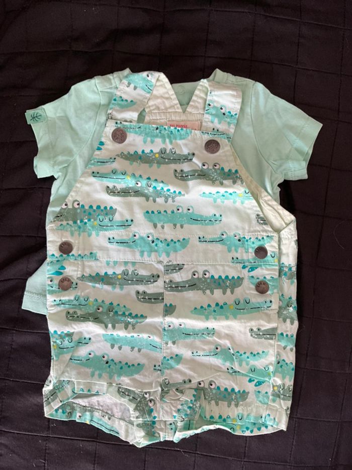 Ensemble salopette courte avec son tee shirt Theme crocodile Vert Clair Du pareil au même Taille 3 mois (59 cm) Très bon état