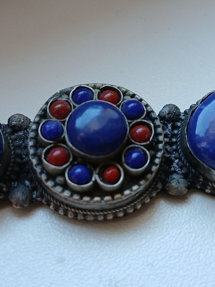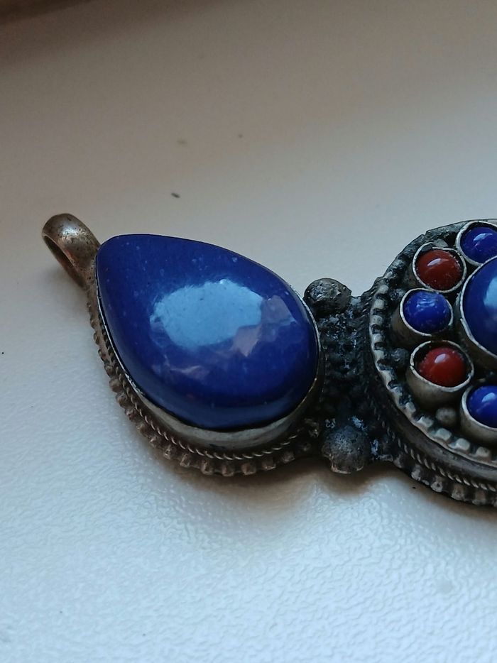 Pendentif tribal pierres bleues et rouges. Acier inoxydable. 6 cm de long. 4 cm de large. Irréprochable