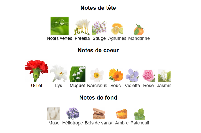 efective classic eau de parfum femme 100 ml Les notes de tête sont Agrumes, Notes vertes, Mandarine, Freesia et Sauge les notes de coeur sont Lys, Œillet , Violette, Jasmin, Souci, Muguet, Rose et Narcissus les notes de fond sont Bois de santal, Ambre, Patchouli, Musc et Héliotrope. Un arôme délicat et raffiné de muguet, de freesia et de lys blanc, se transformant en notes fortes de bois de santal.