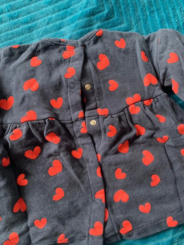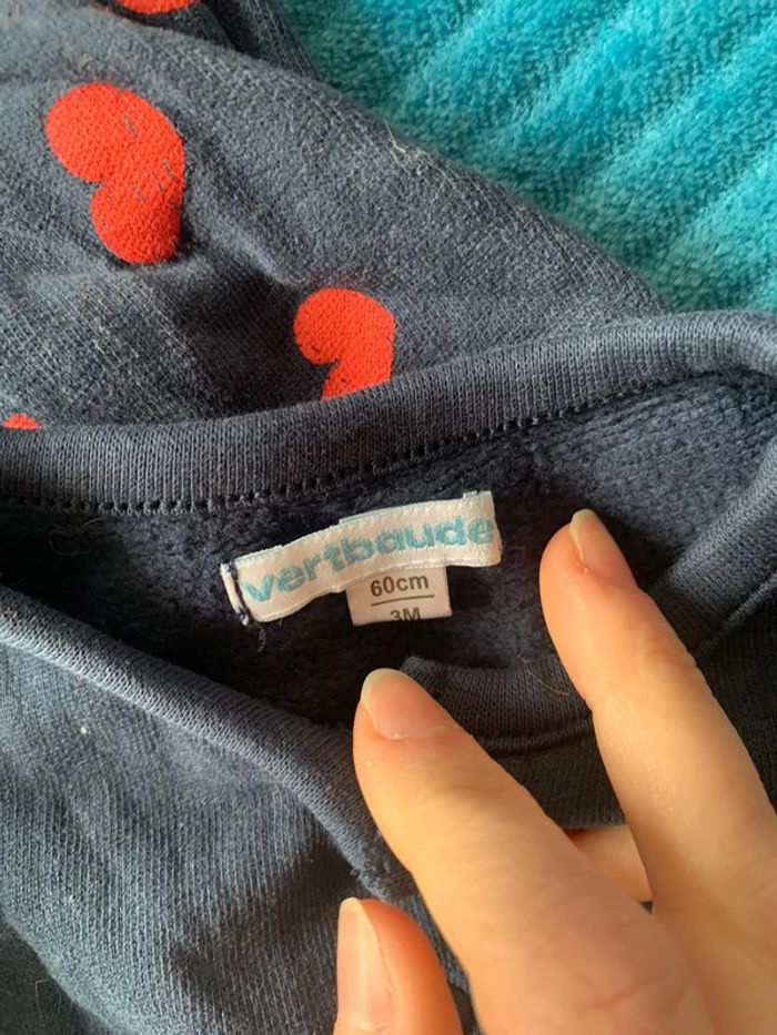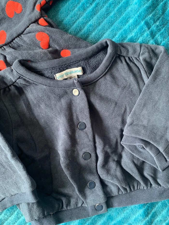 Ensemble fille robe bleue motifs cœurs rouges + gilet bleu Taille 3 mois Acheté neuf et porté 1 fois Verbaudet