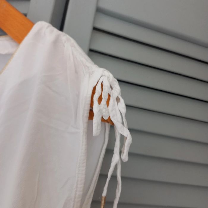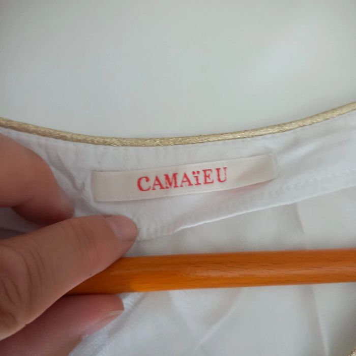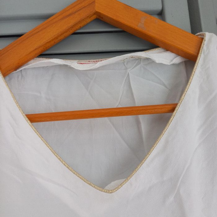 Haut sans manche blanc avec col v Liseré doré au col et noued sur les épaules Camaieu Taille 36