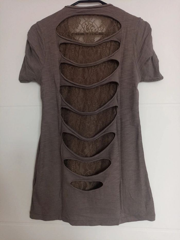 T-shirt manches courtes - coupe ajustée - col rond - dos avec doublure en dentelle - 100% coton - couleur : Kaki - marque : Cache cache - taille 2 (38/40) - en parfait état