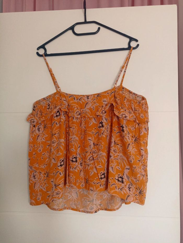 Top long, à fines bretelles réglables - smocké en haut de l'empiècement de chaque côté - volant tout autour du haut du débardeur - marque PROMOD - taille 44 - couleur : moutarde, imprimé fleuri - matière ; 100% viscose - forme ample - très agréable à porter - en parfait état