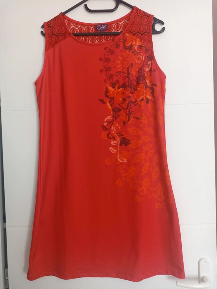 Robe sans manche, - à motifs (couleurs, rouge, rose, violet, beige, noir) - encolure ronde - revers noir sur le col - coupe droite - marque : aller simplement - taille L/XL - matière : 95% polyester, 5% lycra - 2 poches - très agréable à porter En parfait état