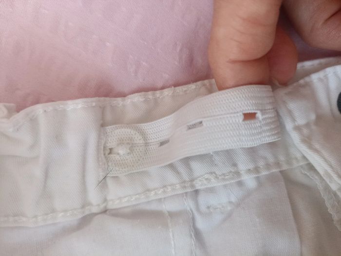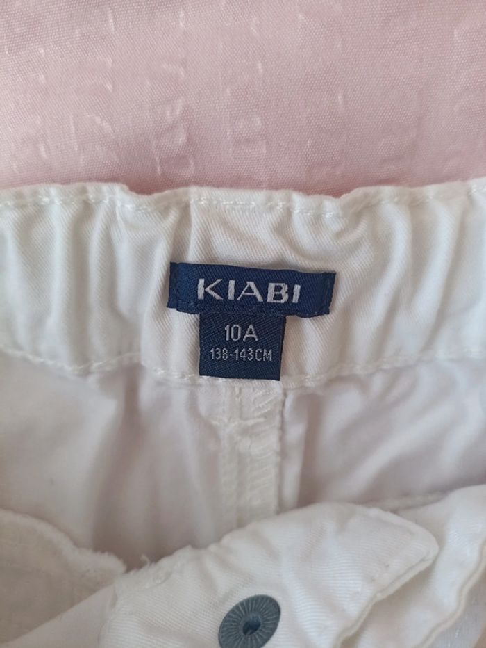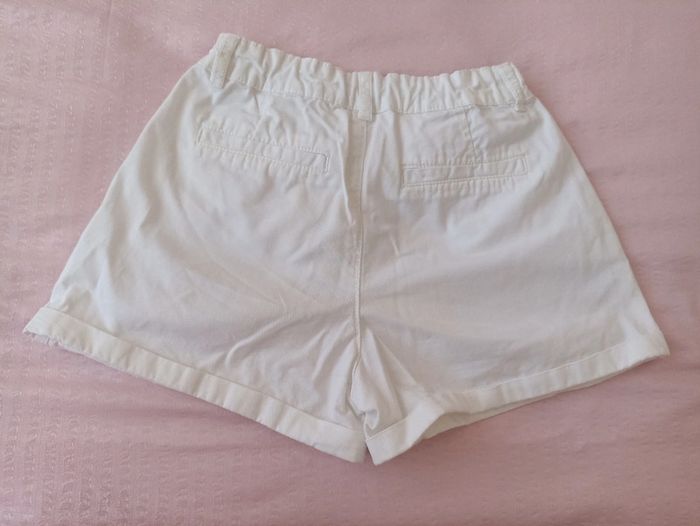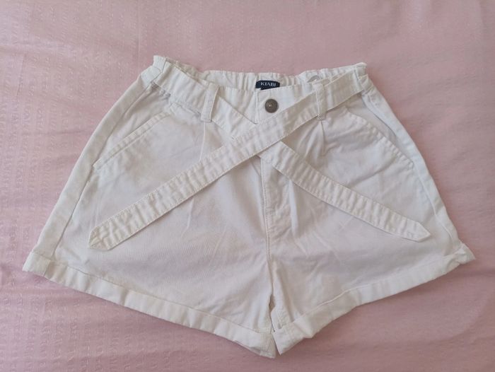 Short fille, de couleur blanc, réglage de la ceinture intérieur par élastique à bouton, taille 10 ans (138-143 cm) marque Kiabi, en coton, 2 poches plaquées devant, ceinture à nouer, en parfait état.